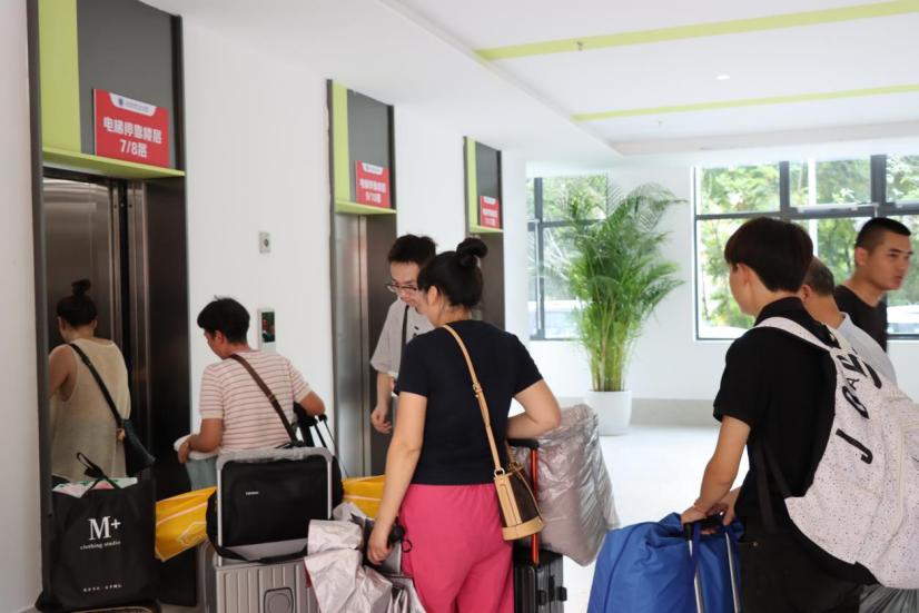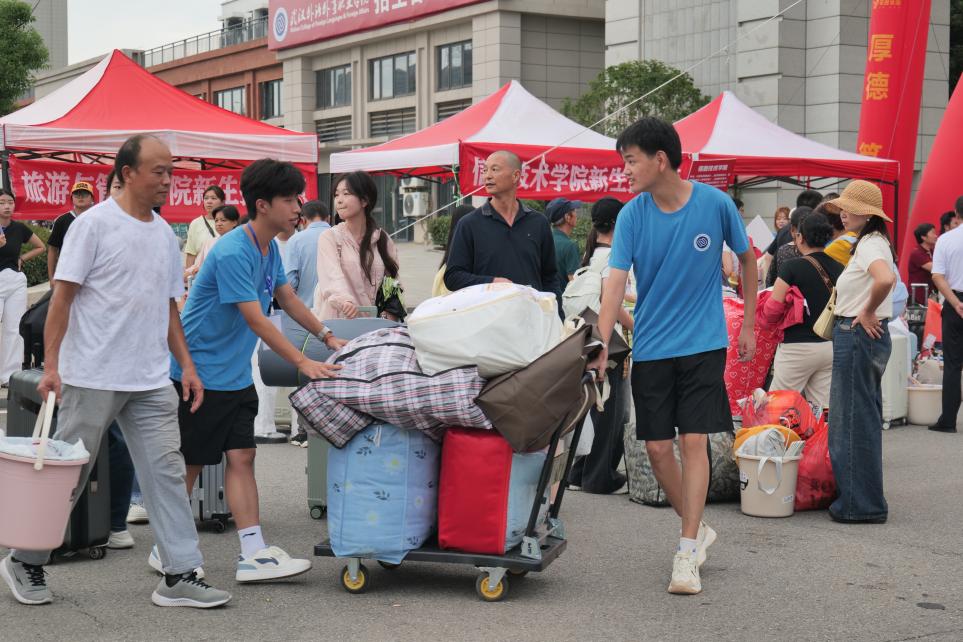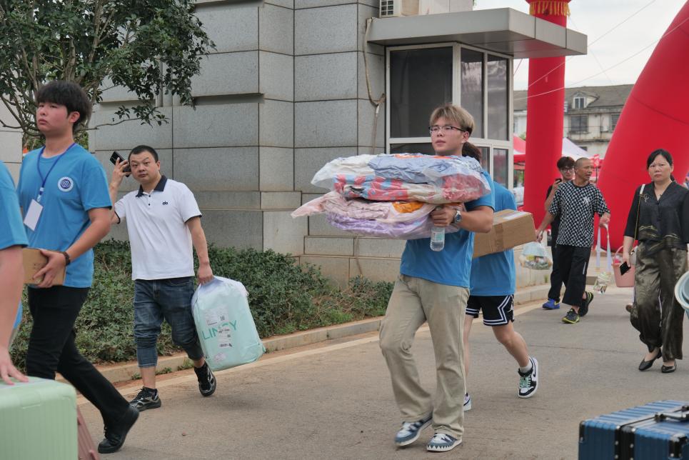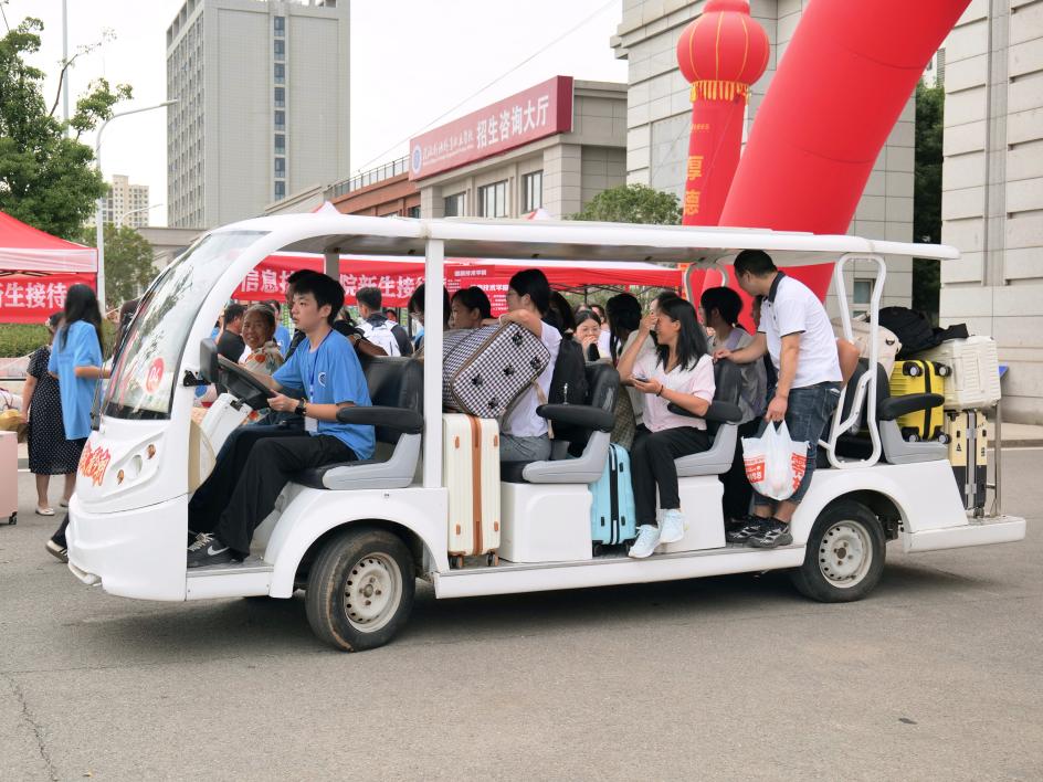在校门口及周边区域,学校统筹设置了多处首站迎新服务点。各二级学院均安排师生志愿者定点值守,通过清晰的标识与主动的引导,确保新生抵达后能第一时间对接所属学院,高效、准确地完成报到流程;学校还专门安排摆渡车与行李搬运车往返于校门和宿舍区之间,切实解决新生“最后一公里”的实际困难。