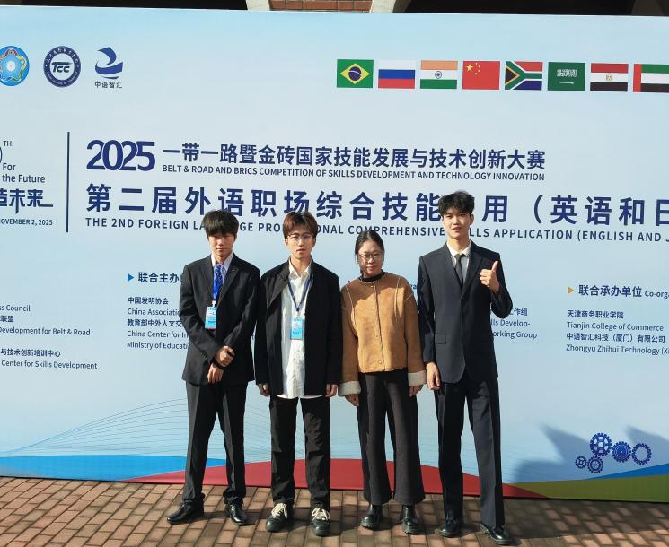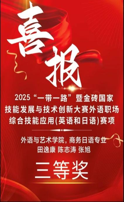 新闻网讯(通讯员 张晨)近日,2025“一带一路”暨金砖国家技能发展与技术创新大赛第二届外语职场综合技能应用(英语和日语)全国总决赛在天津商务职业学院落下帷幕。我校外语与艺术学院商务日语专业学生田逸康、陈志涛、张旭凭借出色的专业素养和职场技能应用能力,在激烈的竞争中荣获全国三等奖,为学校赢得了荣誉。