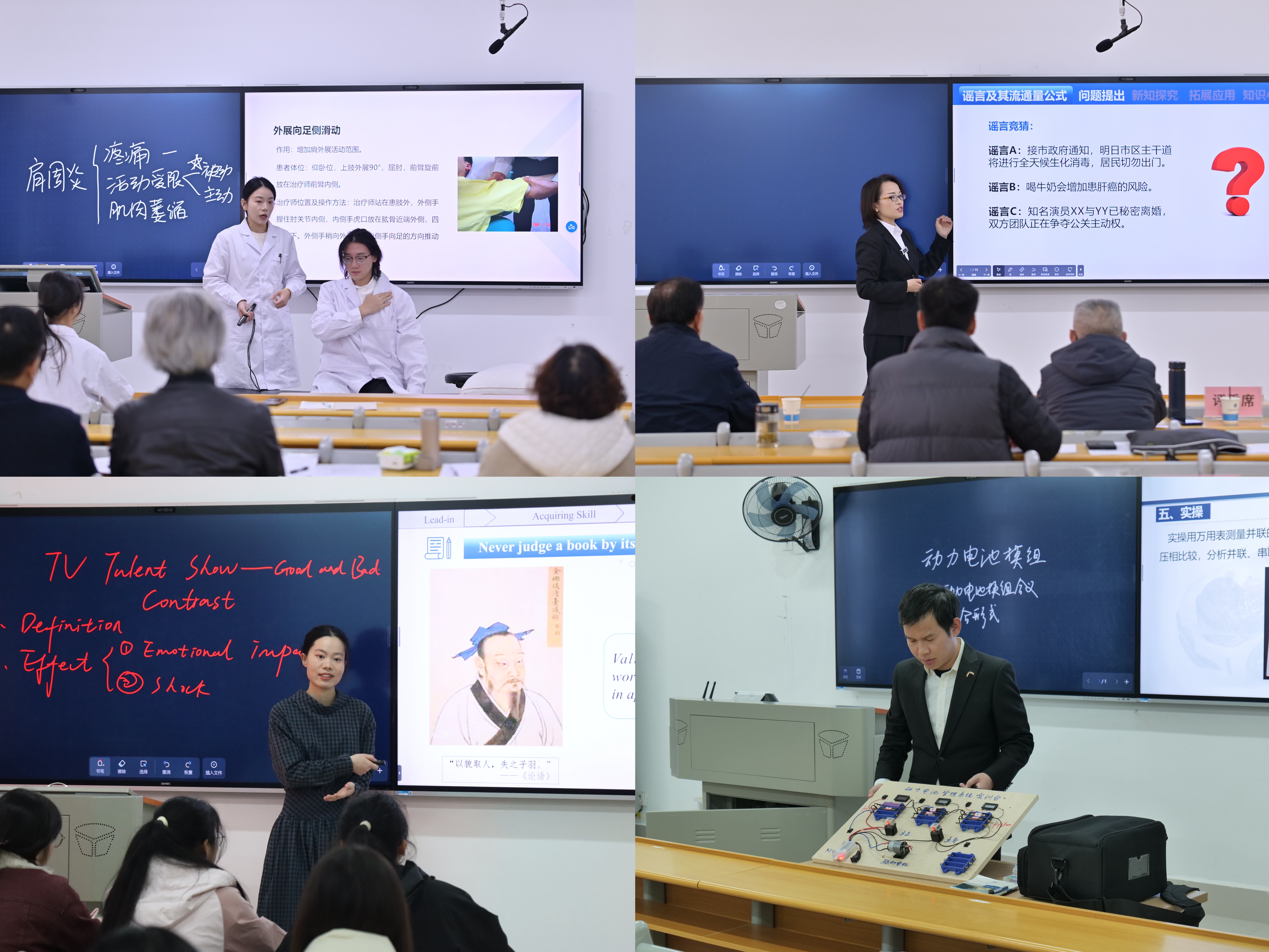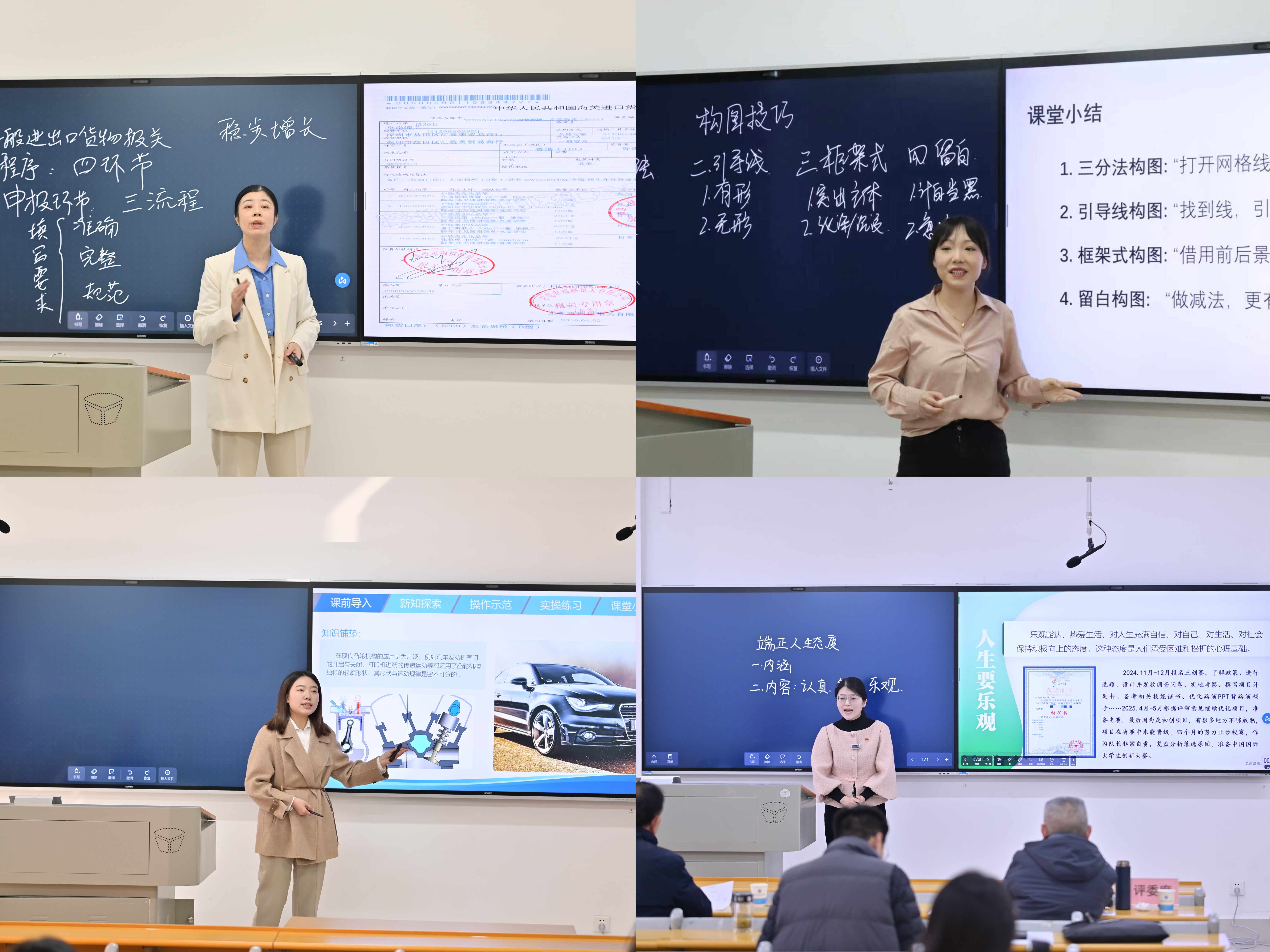 比赛过程中,参赛教师充分借助智慧教室的多功能屏幕等现代化教学设备,将课程思政元素和数字化教学与学科教学实际深度融合。他们熟练运用情景教学、多媒体演示、现场互动问答、模拟实验操作等多样化教学手段,有的聚焦专业知识重难点层层拆解,有的结合行业实际案例强化应用,有的通过小组讨论激发学生思考,既注重知识传授的准确性,又兼顾课堂氛围的互动性,充分展现了青年教师扎实的教学功底和立德树人的育人风采,有效调动了学生参与课堂的主动性。