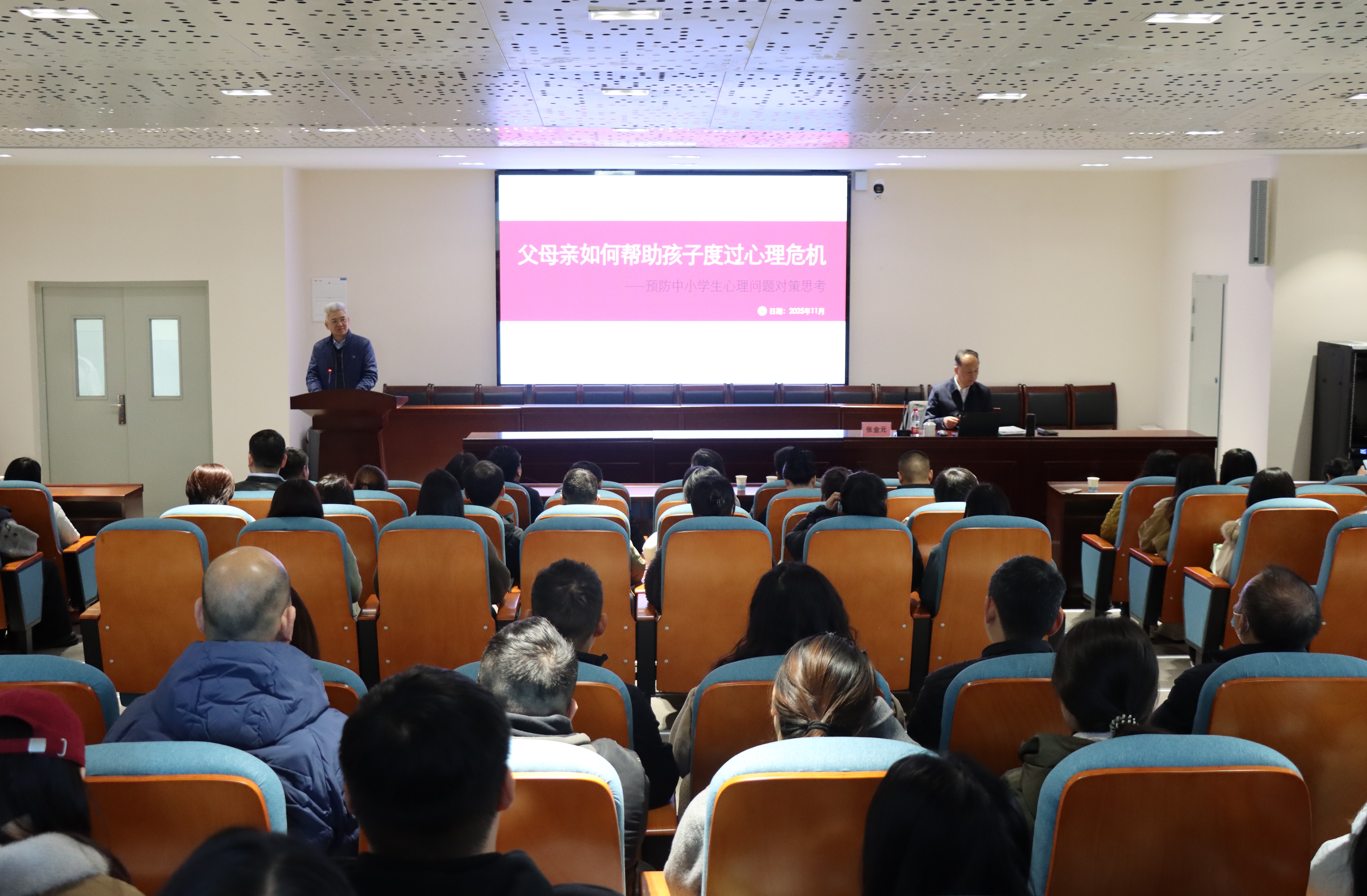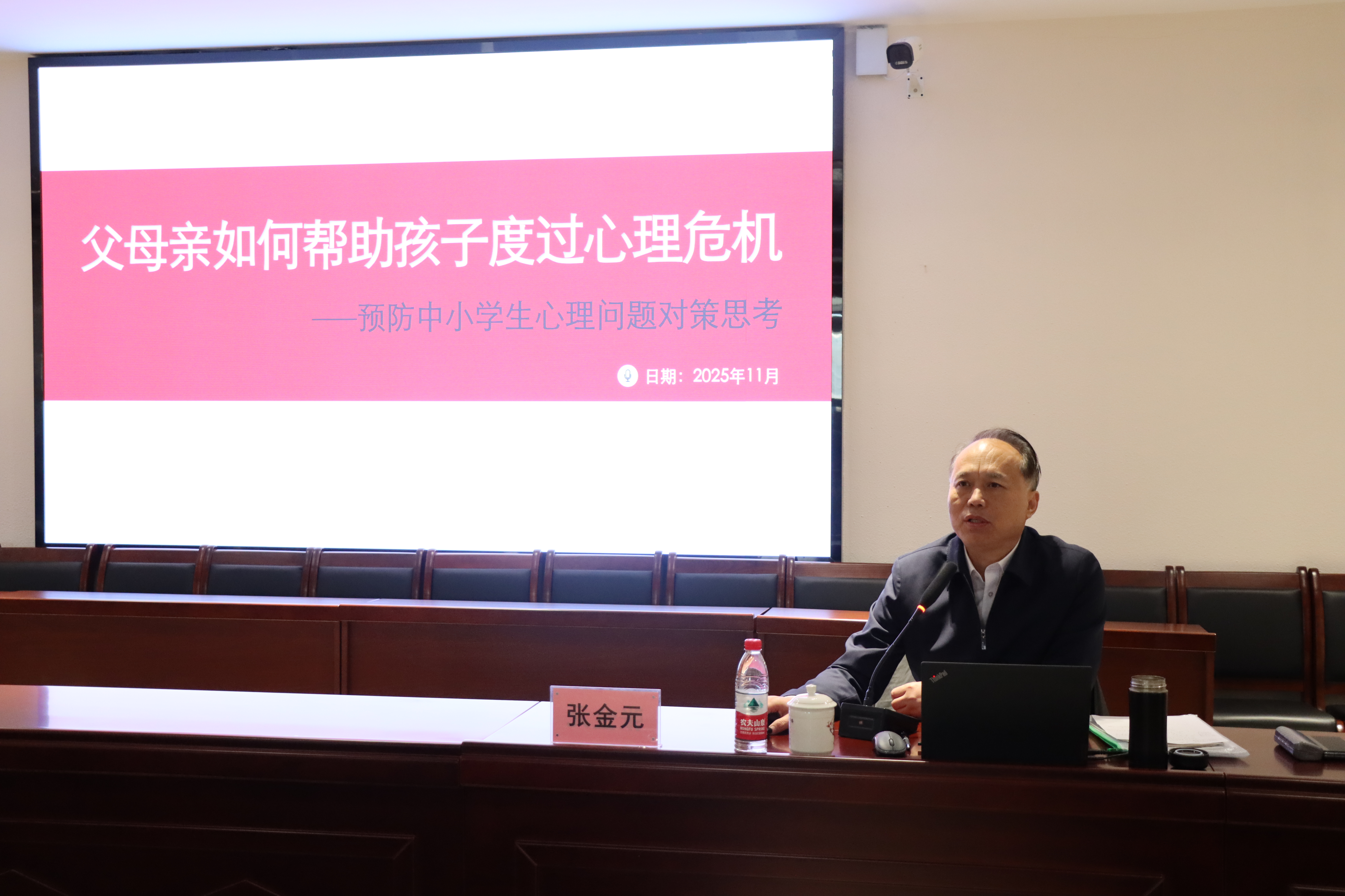 新闻网讯(记者 于秋虹 刘佳琪)11月20日,湖北省生涯教育研究会会长张金元受邀来校在图书馆报告厅开展了一场题为《父母亲如何帮助孩子度过心理危机——预防中小学生心理问题的对策和思考》的专题讲座,全体校领导、各部门及各教学基层单位教职工代表参加讲座。讲座由校党委书记盛建龙主持。