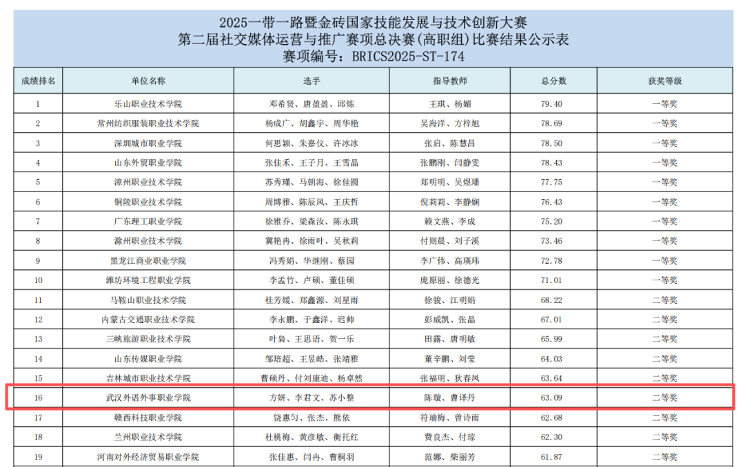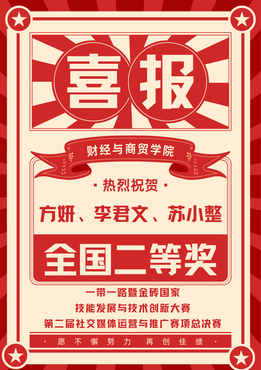 新闻网讯(通讯员 曹译丹)近日,2025“一带一路”暨金砖国家技能发展与技术创新大赛第二届社交媒体运营与推广赛项总决赛圆满收官。我校财经与商贸学院李君文、方妍、苏小整三位学子组成的团队,从全国近百支参赛队伍中脱颖而出,凭借出色的创意策划与实操能力,斩获全国二等奖,实现了学校在该赛项中新的突破,彰显了我校传媒类人才培养的实践实力与创新活力。