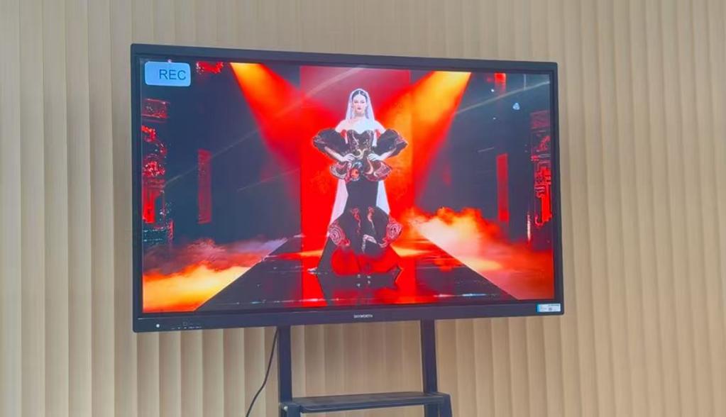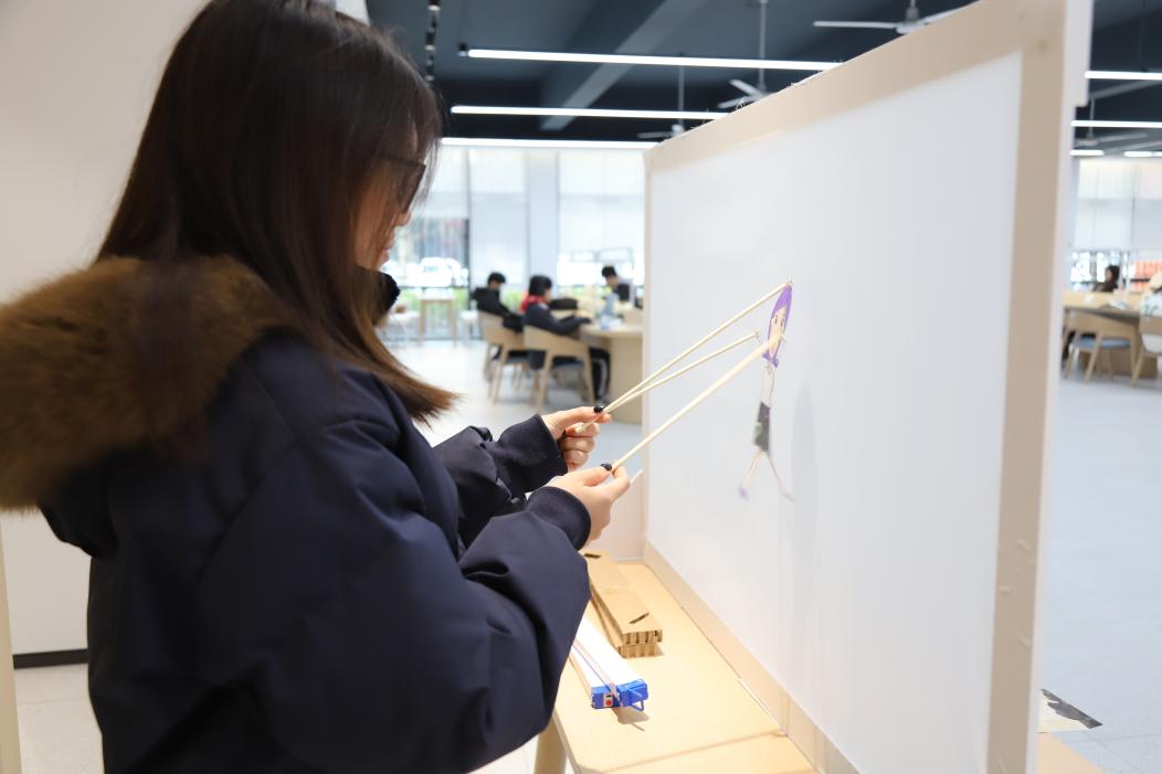 展览现场特设文创展示区与观影欣赏区,互动体验感十足。文创展示区陈列的笔记本、抱枕、小夜灯、帆布包等特色产品,是数字服装创意专业群平台共享课程《数字创意软件应用》的项目教学成果。课程以学校文化为核心载体,聚焦数字创意设计核心技能,引导学生运用专业软件将校徽、校园地标、办学理念等文化元素转化为文创产品设计,完整完成从创意构思、数字化设计到产品落地的全流程,真正实现“作业即产品”;观影区循环播放服装数字化设计技术课程的虚拟服装设计视频,同时设置皮影戏现场体验活动,让观众沉浸式感受数字技术与传统艺术的碰撞融合。