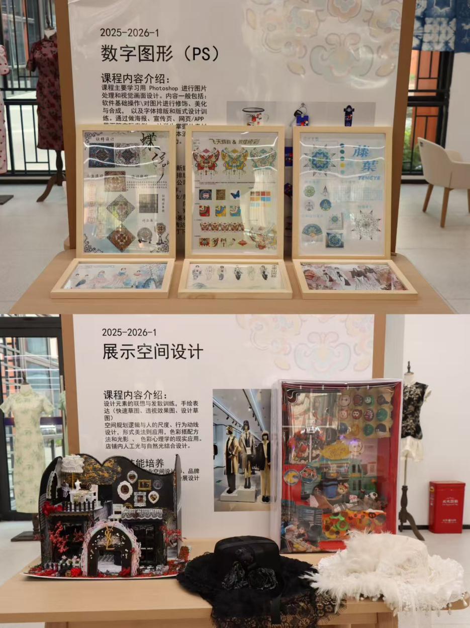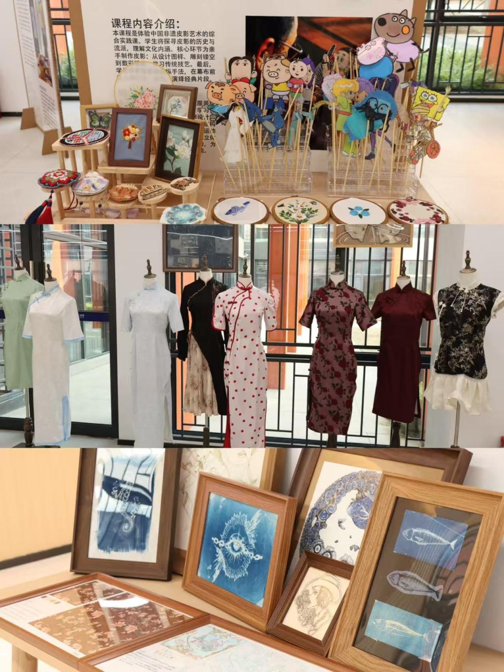 非遗传承板块成为展览一大亮点。《非遗教育》中,学生探寻皮影历史流派,完成设计、雕刻、敷彩等全流程制作;《服装纸样设计与工艺》以旗袍为载体,传授结构设计与传统缝制技艺,学生通过面料归拔、手工盘扣等工序完成作品,对接相关岗位需求;《岗位技能实训》围绕图案设计与印染技术展开,学生完成从构思到成品的全流程实践。