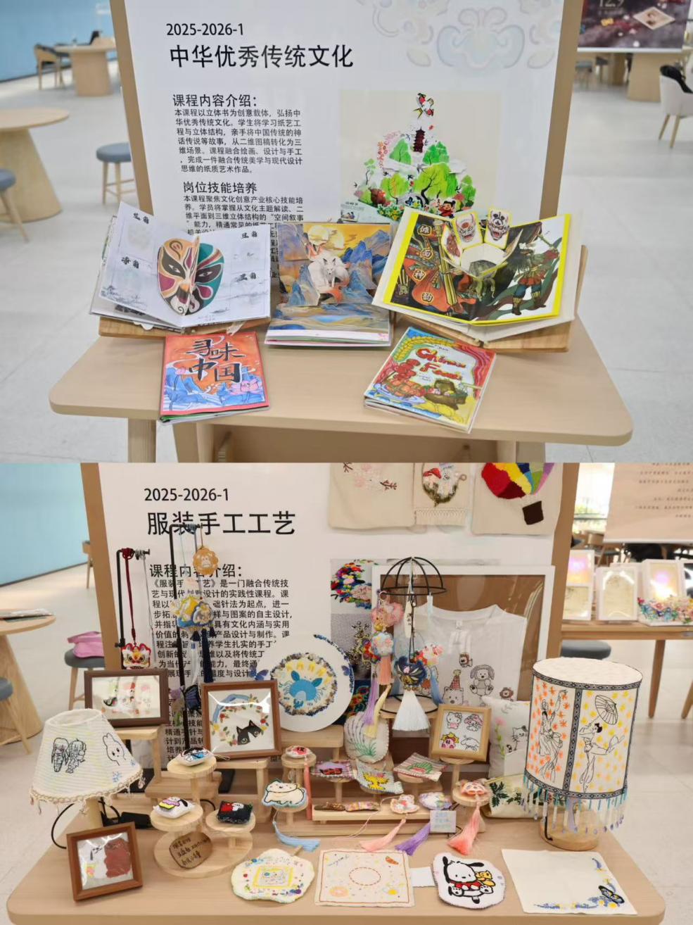 本次成果展涵盖服装手工工艺、服装纸样设计与工艺、数字图形设计(PS)、非遗教育、中国传统文化、岗位技能实训、展示空间设计等多门特色课程,均以“文化传承+技能培养”为核心,构建理论与实践深度融合的教学体系。《数字图形设计(PS)》聚焦Photoshop软件应用,开展图片修饰合成、字体排版与版式设计训练,通过海报、宣传页等实践作品提升视觉设计能力;《展示空间设计》聚焦设计元素发散、空间规划与色彩光影应用,融入传统文化,培养复合型设计人才;《中国传统文化》以立体书为载体,通过纸艺工程学习,将传统神话转化为三维场景,实现跨界融合;《服装手工艺》以传统针法为基础,引导图案设计与作品创作,打造兼具文化内涵与实用性的服饰。