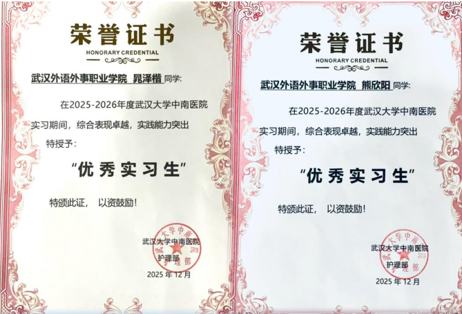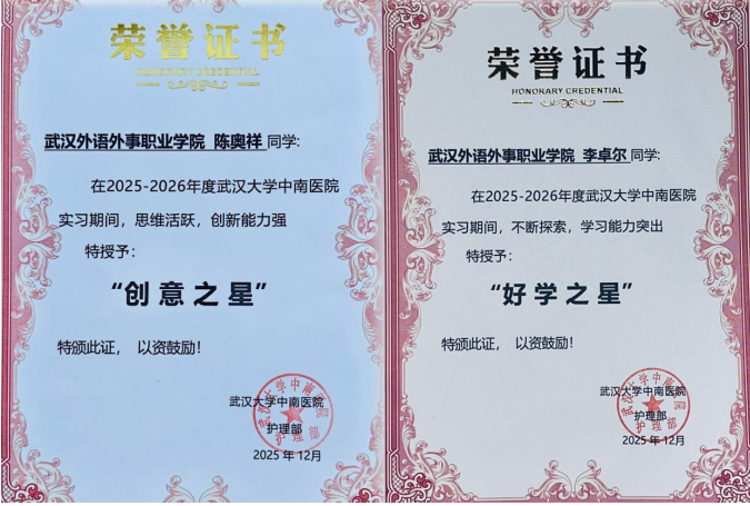本次大会旨在表彰在临床实习期间展现出突出专业素养与高度职业精神的优秀实习生。会上,中南医院护理部主任冯毕龙首先致辞,对各合作院校的人才培养工作表示认可,对实习学子的职业风貌予以高度评价。随后,护理部副主任张春华宣读表彰决定,对实习期间表现突出的个人予以表彰激励。我校医疗与护理学院实习学子在此次评选中斩获多项荣誉,其中晁泽楷、熊欣阳两位同学荣获“优秀实习生”称号,他们在临床实践中展现出扎实的专业素养与综合能力,是实习生中的优秀代表;陈奥祥同学荣获“创意之星”称号,他在实践中展现创新思维,为护理工作注入新的灵感与活力;李卓尔同学荣获“好学之星”,她始终保持学习热忱,在知识积累与临床思考中不断精进。