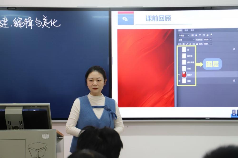 为了呈现最完美的课堂效果,周翼南老师反复打磨每一处教学细节。在讲解图层相关知识点时,她不仅详细阐释图层混合模式等复杂概念,还通过生动形象的案例,如利用“花+颜色”“叶+反差”等示例,让学生轻松理解抽象理论。每一堂课,她都多次演练,精确计算时间,确保教学内容紧凑有序。