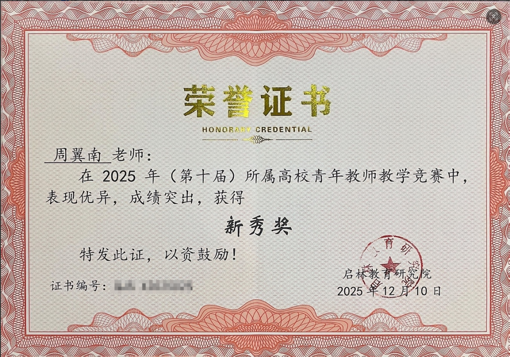 在竞赛现场,周翼南老师凭借清晰的教学思路、生动的教学方法以及出色的课堂掌控能力,赢得了评委们的一致认可。最终,她成功斩获新秀奖,这份荣誉不仅是对她个人教学能力的肯定,也是学院教师团队共同努力的见证。