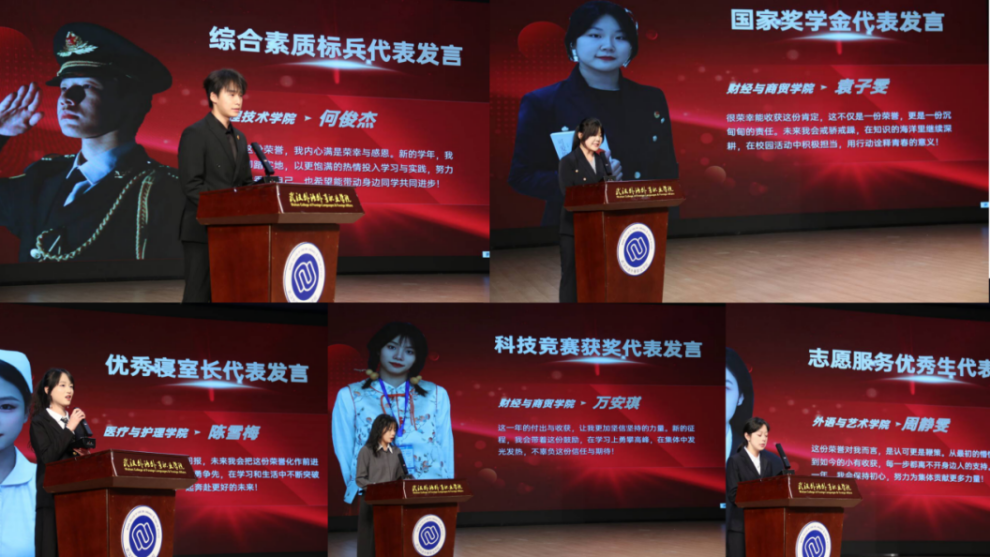 随后,优秀寝室长代表陈雪梅、志愿服务优秀生代表周静雯、科技竞赛获奖代表万安琪、综合素质标兵代表何俊杰、国家奖学金代表袁子雯先后发言。他们分享了在寝室管理、志愿奉献、科技创新、全面发展与学业深耕中的经历与感悟,言语真挚、催人奋进,展现了外院学子勤学善思、笃行实干的良好风貌,为在场同学传递了奋进力量。