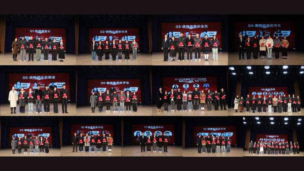 大会依次为优秀寝室长、优秀心理安全员、优秀应急安全员等13类奖项获奖代表颁奖。优秀寝室长以责任筑牢温馨港湾,优秀心理安全员用爱心守护心灵晴空,优秀应急安全员以担当筑牢安全屏障,素质拓展优秀生在多元舞台绽放光彩,志愿服务优秀生用行动诠释奉献精神,暑期社会实践与科技竞赛获奖者在实践与创新中锤炼本领。德育素质奖学金、专业素质奖学金、国家励志奖学金及国家奖学金获得者依次登台,接受表彰。校领导与职能部门负责人为获奖学生颁奖并合影,每一份荣誉都承载着学校的肯定与期许,每一张笑脸都定格着青春的奋斗与荣光。