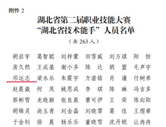 新闻网讯(通讯员 李颖)近日,湖北省第二届职业技能大赛获奖名单正式公布。信息技术学院参赛选手凭借扎实的专业技能与出色的现场发挥,在多个赛项中脱颖而出,共斩获铜牌1项、优胜奖3项。其中,邓运志同学荣获“湖北省技术能手”称号,李颖老师获评大赛“优秀教练”。