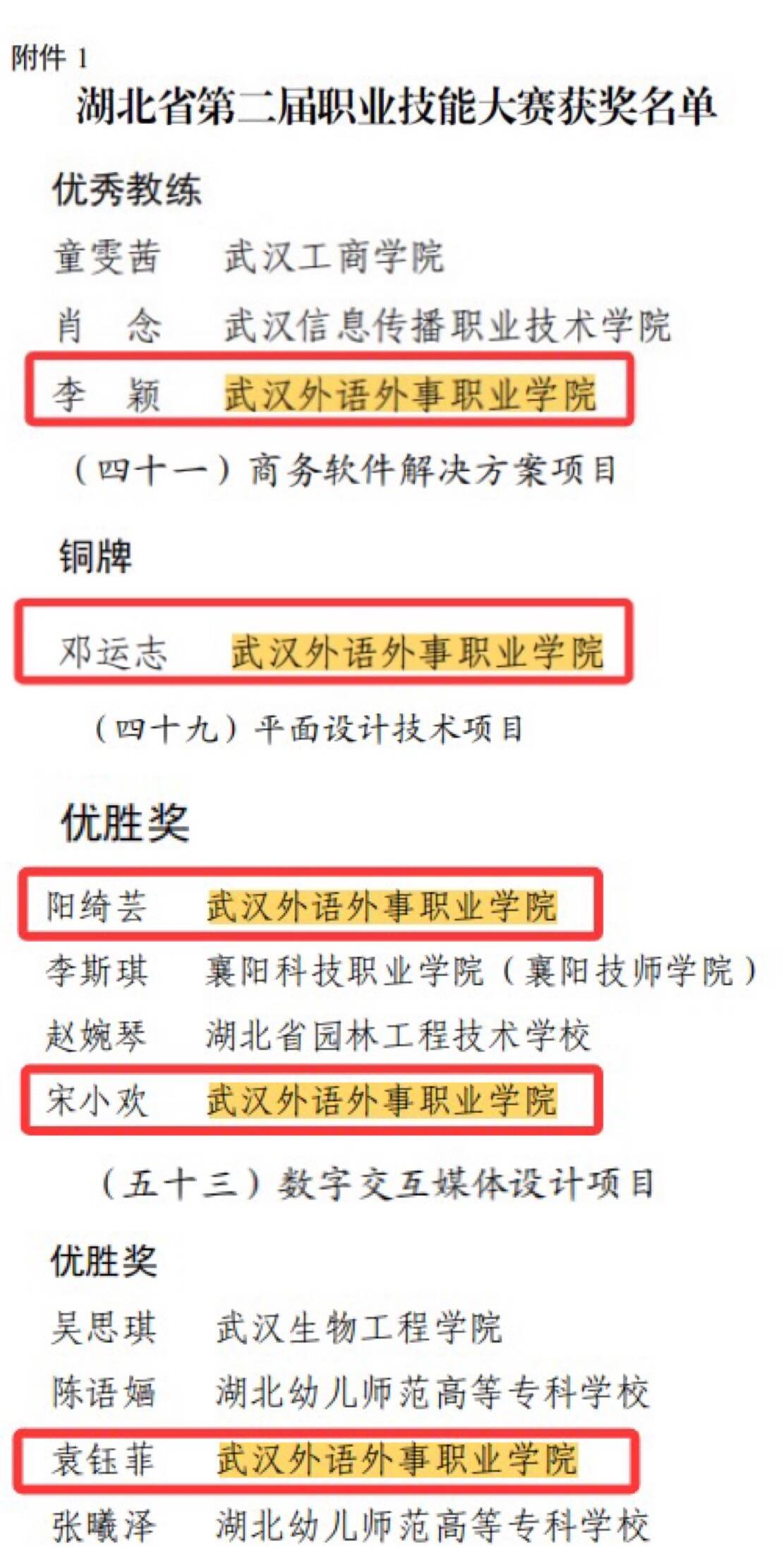 本次大赛由湖北省人民政府主办,省人力资源和社会保障厅、省教育厅、省总工会共同承办,是全省范围内规模大、水平高、影响广的综合性职业技能赛事。本次大赛汇聚了全省近50所学校的精英队伍同台竞技,各赛项经过激烈比拼,最终邓运志同学获得商务软件解决方案项目铜牌,阳绮芸、宋小欢同学获得平面设计技术项目优胜奖、袁钰菲获得数字交互媒体设计项目优胜奖。
