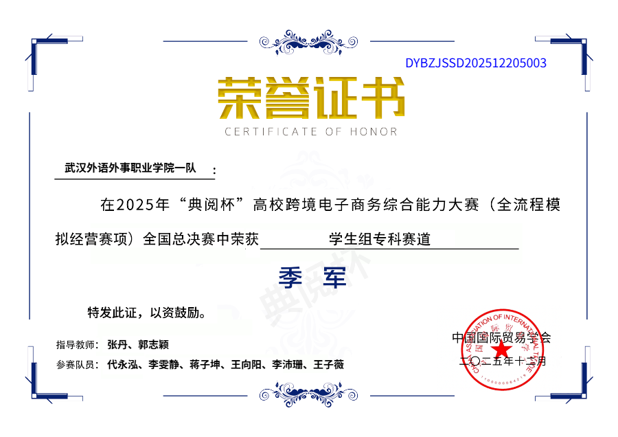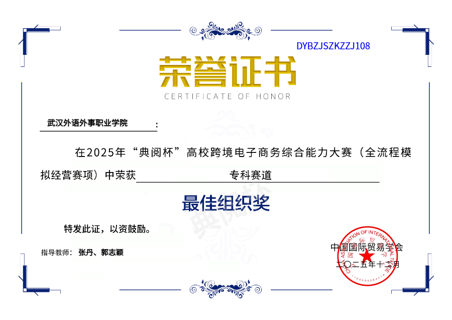 新闻网讯(通讯员 张丹)近日,2025“典阅杯”全国跨境电子商务综合能力大赛全国总决赛圆满落幕。经过激烈角逐,由财经与商贸学院张丹、郭志颖两位老师指导,财经与商贸学院跨境电子商务专业学生组成的第一代表队,凭借出色的专业素养、创新的思维能力和紧密的团队协作,最终荣获全国总决赛学生组专科赛道季军。同时,我校因组织工作突出、团队表现优异,被授予“最佳组织奖”。