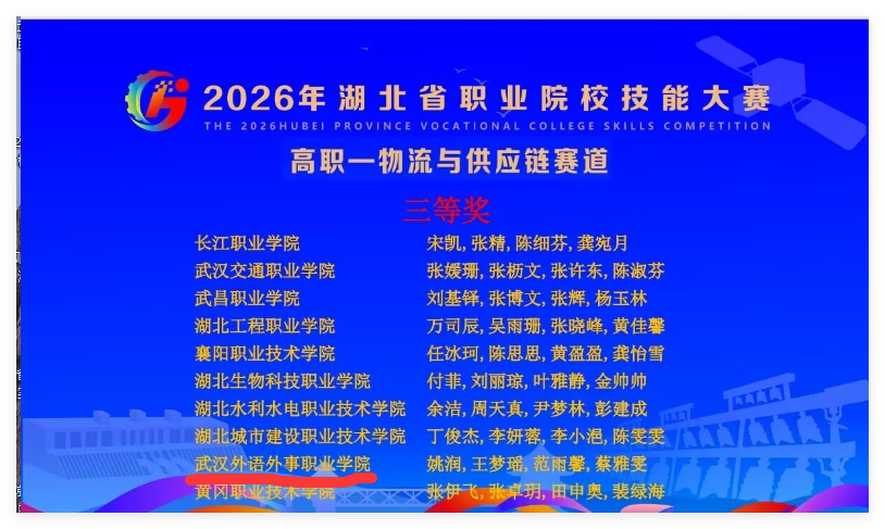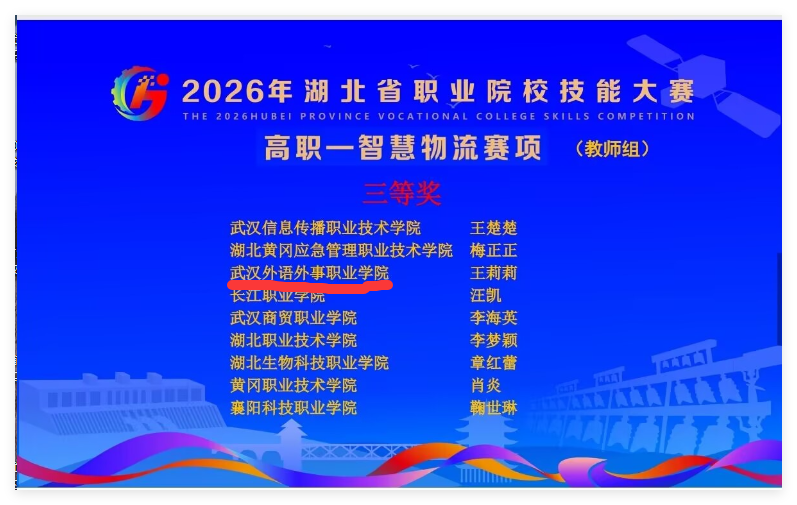 新闻网讯(通讯员 王璐 王莉莉)近日,2026年湖北省职业院校技能大赛各赛项陆续落幕,我校数智财金与商贸服务学院师生在赛场奋勇拼搏,于“智慧物流” “业财税融合大数据应用”两大领域喜获多项省级三等奖,展现了扎实的专业素养与出色的教学实践能力。