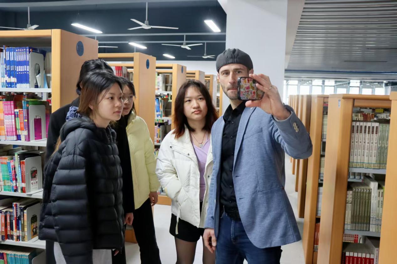 拍摄期间,师生团队先后在图书馆、实训楼、专业教室等校园地标取景,在真实场景中完成多场戏份录制。与传统课堂以理论讲授、词汇记忆为主的模式不同,此次微电影拍摄将语言学习融入完整创作流程:从剧本研读、台词推敲到现场演绎,每一句西语对话、每一处语气停顿,都成为学生开口表达、灵活运用语言的实践载体。