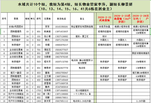 何媚拿到居民情况统计表,第一时间就给小区居民逐一打电话了解基本情况并反馈,对需要帮助的特殊群体重点关注。得知物业和业委会5天会组织一次团购,何媚组建了居民微信群,以方便采集信息集中管理服务。经过努力,她所负责的楼栋很好地完成了居民身体健康状况排查和日登记工作。她时刻为居民们着想,碰到好的选购物资,及时发布在微信群里,询问大家的意见。为降低居民交叉感染风险,她自己带头报名,让每个单元轮流派一个人为居民分发物资到家门口。