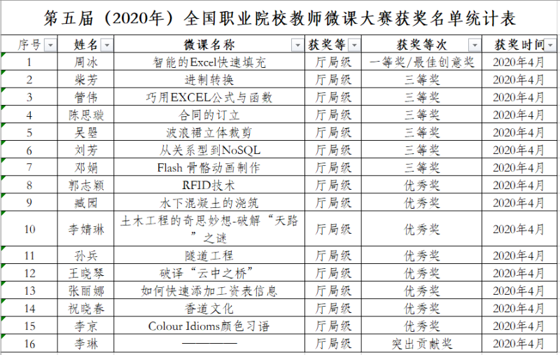 为深入贯彻落实教育部《教育信息化“十三五”规划》、《教育部关于进一步推进职业教育信息化发展的指导意见》等文件精神,推动优质数字教学资源共建共享,我院积极组织教师参加历届全国职业院校教师微课大赛,以提升教师信息技术应用水平、教学创新和专业发展能力,持续深化信息技术与我院教育教学的融合发展。本次大赛,信息工程学部教师周冰的作品《智能的Excel快速填充》荣获一等奖及最佳创意奖,信息技术学部教师柴芳等6名教师的作品分获三等奖,财经与商贸学部教师郭志颖等8名教师的作品获优秀奖,教务处李琳获得突出贡献奖。