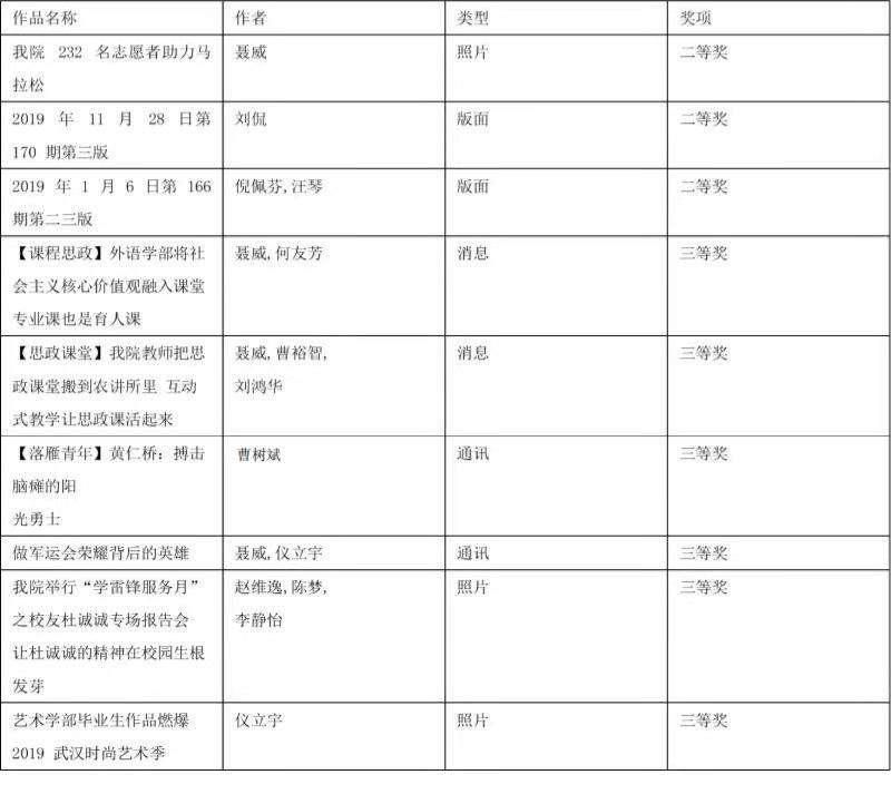 新闻网讯(记者 钟亮)2019年湖北省高校好新闻奖评选结果近日揭晓,我院报送的新闻作品3件获湖北省高校新闻奖二等奖、6件获三等奖。
