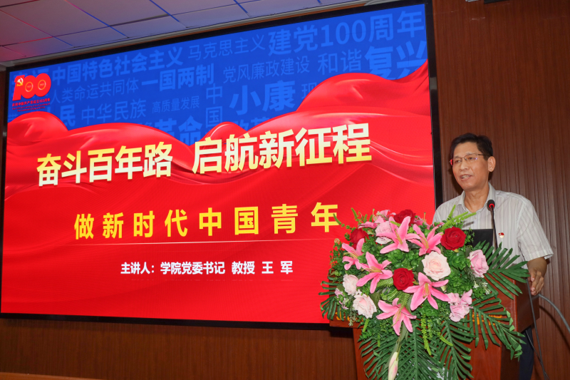 王军以“奋斗百年路 起航新征程——做新时代中国青年”为题为2021级新生讲授“开学第一课”。王军从丰功伟绩恢弘史诗、精神血脉代代相传、以史为鉴开创未来、时代新人担当使命四个方面,为新生详细阐述了中国共产党在一百年历程中所创造的新民主主义革命、社会主义革命和建设、改革开放和社会主义现代化建设、新时代中国特色社会主义的伟大成就,强调了坚持真理、坚守理想展现了中国共产党的强大思想优势;践行初心、担当使命展现了中国共产党的强大政治优势;不怕牺牲、英勇斗争是中国共产党的强大精神优势;对党忠诚、不负人民展现了中国共产党的强大道德优势。