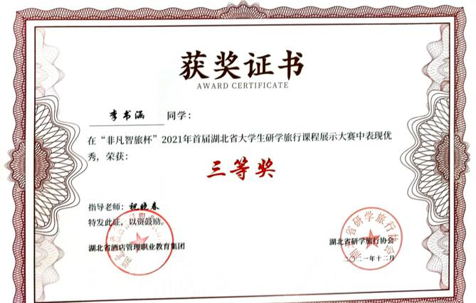 新闻网讯(通讯员祝晓春)12 ⽉ 3 ⽇,湖北省酒店管理职业教育集团、湖北省研学旅⾏协会、武汉城市职业学院共同主办的“⾮凡智旅杯”2021 年⾸届湖北省⼤学⽣研学旅⾏课程展示⼤赛在武汉园博园长江文明馆圆满落幕,我院2020级旅游管理专业学生李书涵在其教师祝晓春的指导下呈现的 《拥抱自然,为“艾”出发——李时珍博物馆》、2021级高铁专业学生颜娜在其教师梁川飞指导下展示的《品古诗、明信仰、访神兽——黄鹤楼诗词研学游》研学课程均获得三等奖的好成绩。