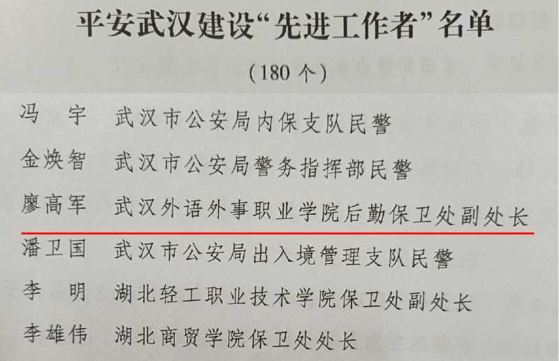 新闻网讯(记者袁晚露)近日,武汉市公安局下发《关于平安武汉建设“优秀单位”“先进工作者”和“平安建设联系点示范项目”的表扬通报》,表彰在2021年度积极投身平安武汉建设表现突出的180个平安武汉建设“优秀单位”、180名平安武汉建设“先进工作者”和10个“平安建设联系点示范项目”。我院后勤保卫处副处长廖高军被评为平安武汉建设“先进工作者”。