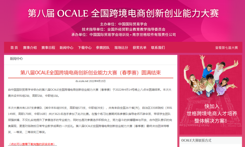 OCALE全国跨境电商创新创业能力大赛是由中国国际贸易学会和全国外经贸职业教育教学指导委员会共同主办的一项全国性的国际经济与贸易专业赛事,旨在深化教育部“以能力和职业发展为导向”的新兴人才培养要求,推动院校探索建立跨院系、跨学科、跨专业交叉培养创新创业人才的新机制,促进人才培养由学科专业单一型向多学科融合型转变,培养学生创新精神和实践能力,以创业带动就业,促进毕业生充分就业。