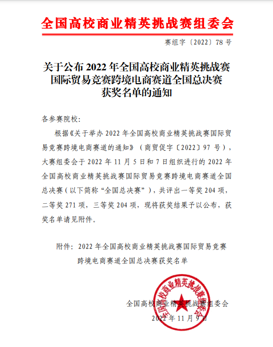 新闻网讯(通讯员 刘文 王晓宁)11月5日和7日,2022年全国高校商业精英挑战赛国际贸易竞赛跨境电商赛道全国总决赛在线上成功举办。我院应用外国语学部、财经与商贸学部分别组队参赛,其中应用外国语学部“师傅说得队”在教师刘文、赵秀丽的指导下获得全国高(中)职组二等奖,财经与商贸学部“山顶见队”在教师郭志颖、周昕的指导下获得全国高(中)职组三等奖。