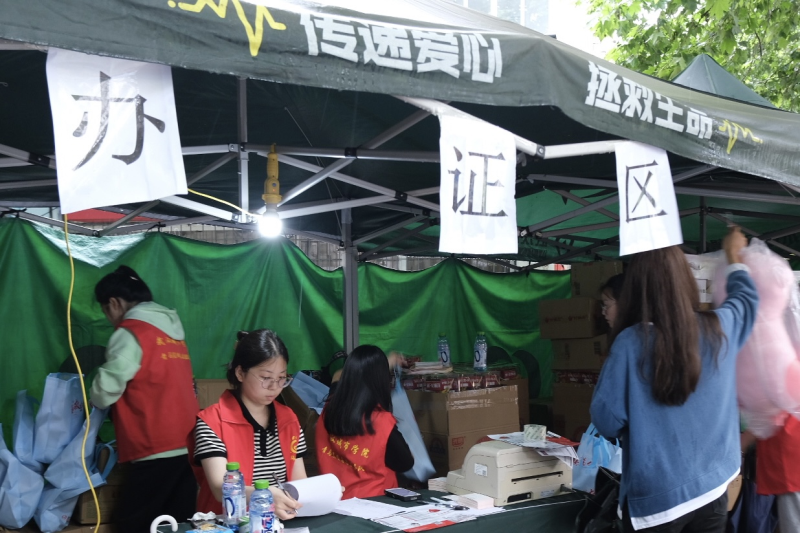 当日正午时分,雨势突然加大,热心的志愿者撑伞护送学生们前往献血准备棚,志愿者用自己的行动传递着爱的火炬。