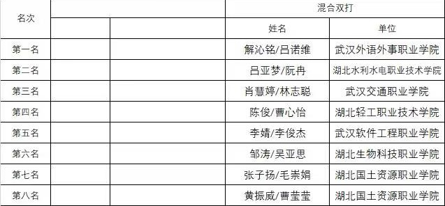 男子团体比赛中,小组赛在首场负于武汉职业技术学院的不利情形下,我院男团发扬敢打敢拼、永不言败的优良作风,后续接连战胜本组种子武汉警官职业学院和鄂州职业大学,以小组第二出线进入8强争夺战,八强比赛中以2分之差惜败于湖北国土资源职业学院,止步8强。虽然团体赛憾负,但队员们并未气馁,力争在单项比赛中取得好名次,为校争光。接下里的各个单项比赛中,最终我院头号混双选手解沁铭/吕诺维连胜5轮,一举拿下乙组混合双打第一名的好成绩,这也是我院混合双打取得的历史最佳战绩。
