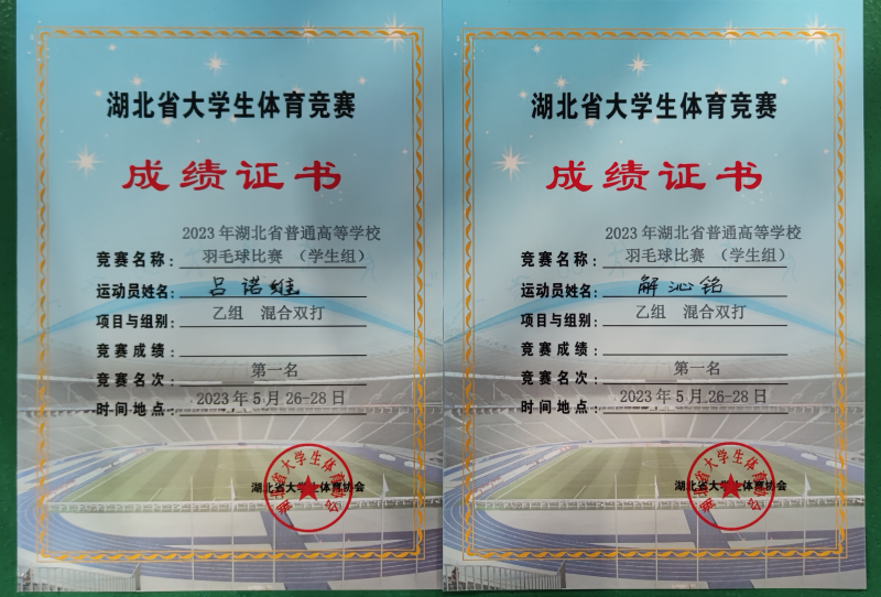 新闻网讯(通讯员 彭辉)2023年湖北省大学生羽毛球锦标赛于5月26日-28日在武汉大学举行,我院羽毛球队经过三天的奋力拼搏,获得乙组(高职高专组)混合双打第一名的历史最佳战绩,这也是继2018年省运会、2019年锦标赛蝉联男子单打冠军后,我院羽毛球队再次在单项比赛中站上最高领奖台。这标志着我院羽毛球单项实力再次回到全省高职高专组及非专业组的前列。