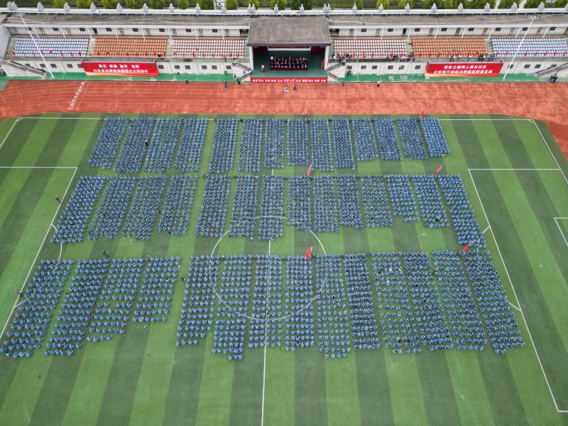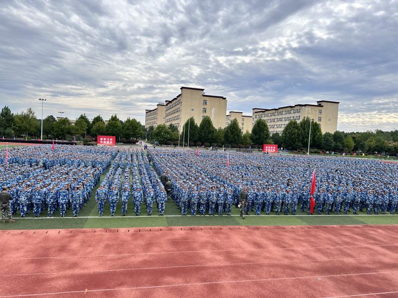 2023级全体新生统一着军训服入场,面庞青春而坚定。