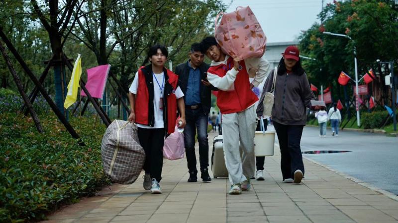 “立大志,展宏图,圆理想之梦”“想接过你的行李,告诉你未来可期”。校园各处,热情红的迎新横幅和身着红马甲的志愿者合力描绘出一幅热闹迎新的画卷。新生一入校,学生志愿者们便上前接过行囊,帮助新生便捷报到,让新生和家长感受到家的温暖。“我想把志愿者服务的热情传递下去,”于9月10日来校报到的2023级新生、财经与商贸学部融媒体技术与运营2班学生杨思在熟悉校园后,以志愿者的身份投入到迎新工作中。