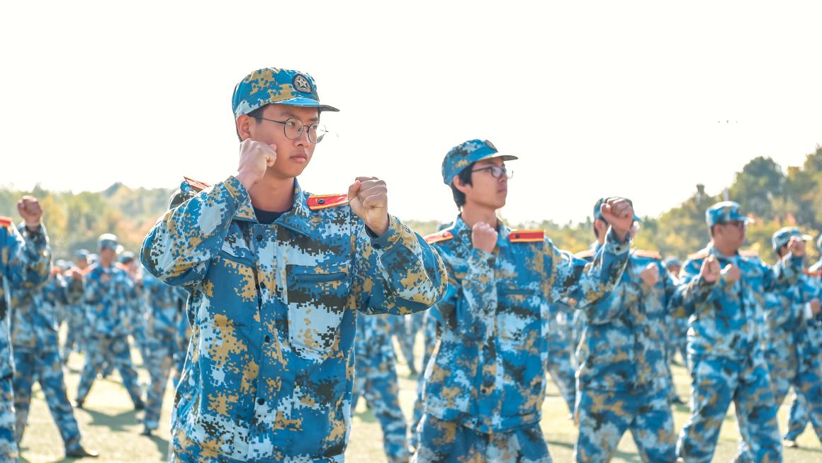 军体拳展示中,学生们身姿挺拔站立,手臂舒展开来,抬腿齐步,以铿锵有力的口号为伴,声音划破了运动场,传递出他们心中坚定的理想信念和对大学生活的美好向往。