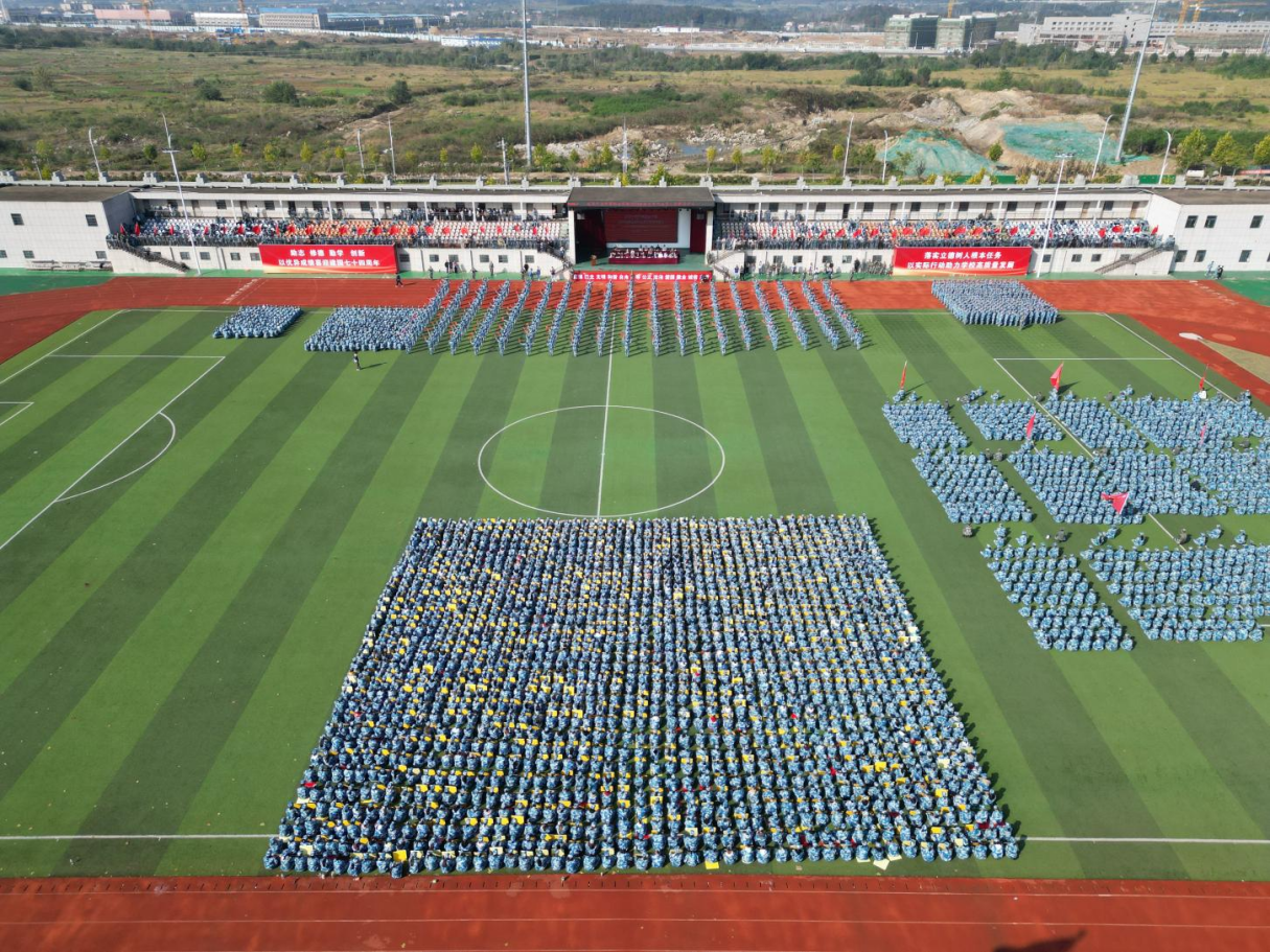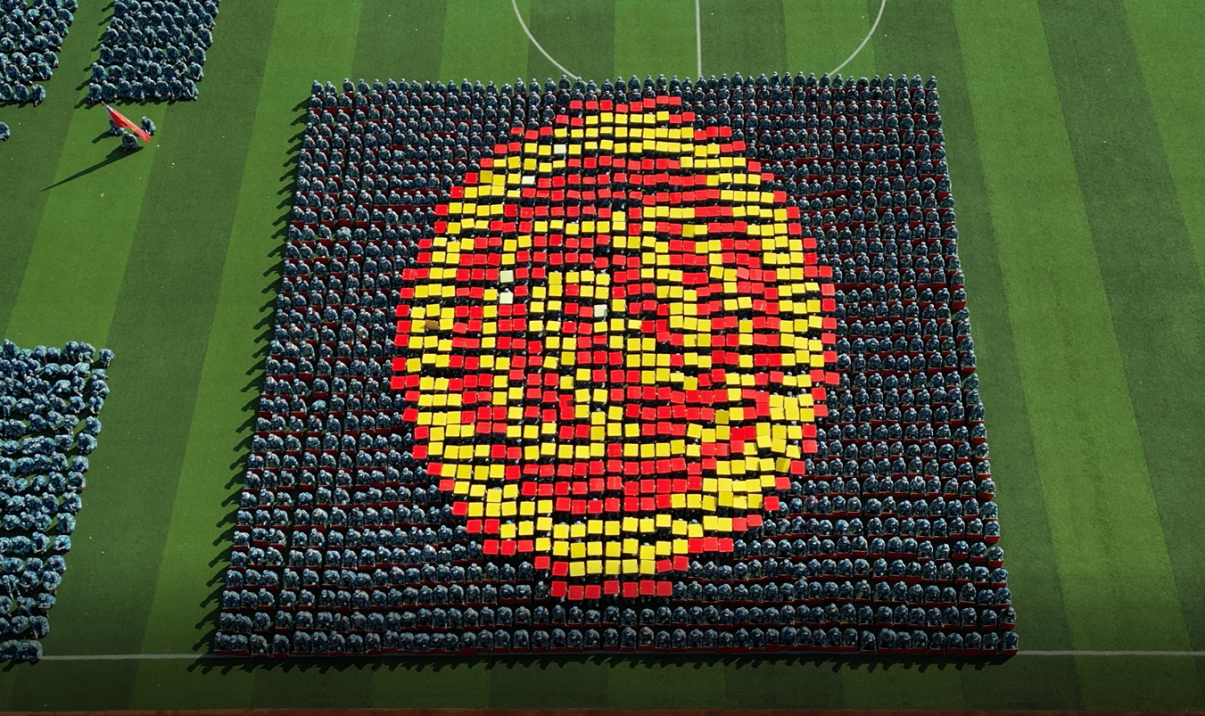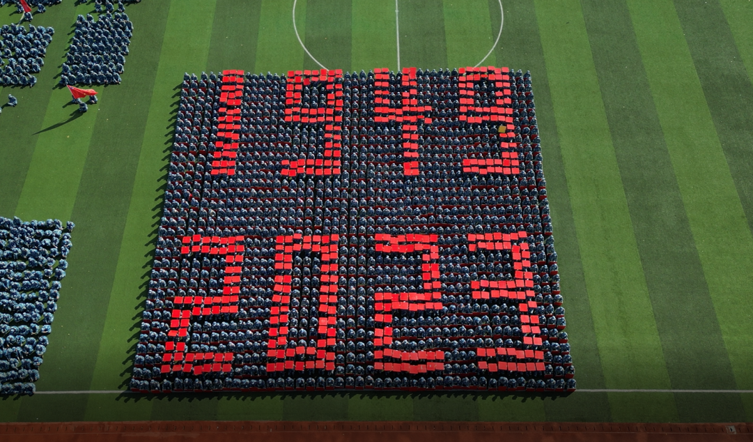 最吸人眼球的是花样方阵的表演。学生们手拿红、黄两色卡片板,借助军服颜色的反差,加上蹲下与起立行动的配合,伴随着铿锵有力的解说词熟练地变换队形,摆出1949-2023、中国万岁、国旗、2002-2023、校徽、校名、天安门、华表柱、不忘初心牢记使命等图案,不仅表达了对祖国的热爱和忠诚,更传递出我校团结合作、积极向上和追求卓越的优良校风,将现场气氛推向高潮。学生们紧密合作,默契配合,图案迅速转换,赢得现场掌声连连。