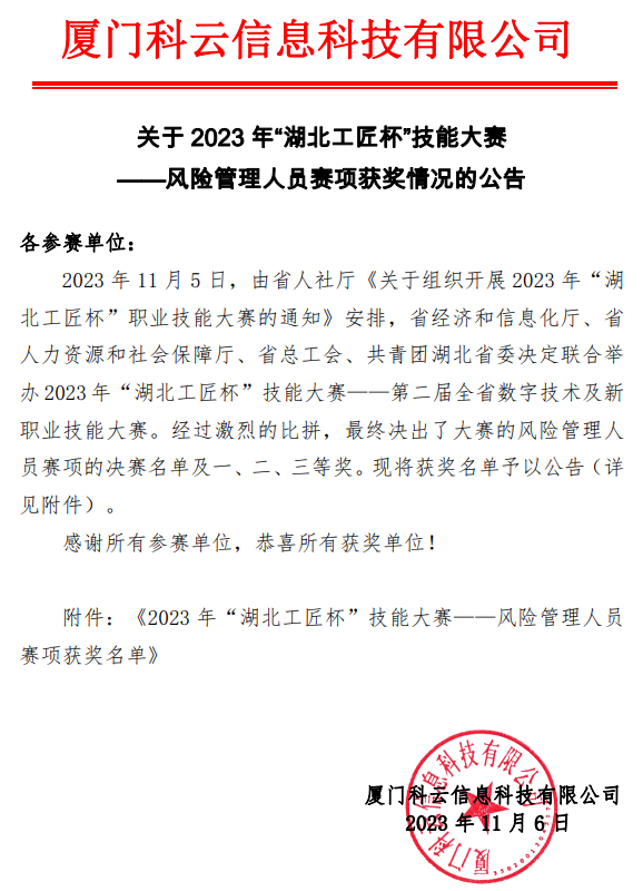 新闻网讯(通讯员 陈计专)近日,由省经济和信息化厅、省人力资源和社会保障厅、省总工会、共青团湖北省委联合举办的2023年“湖北工匠杯”技能大赛圆满结束。我院财经与商贸学部选派出3位学子在风险管理人员赛项中,细心谨慎、沉着应战,经过激烈角逐,最终大数据与会计专业学生尹婉祯脱颖而出,获省赛二等奖。