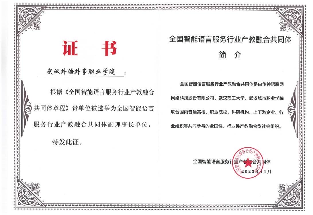 新闻网讯(通讯员熊莺)11月22日,全国智能语言服务行业产教融合共同体(以下简称“共同体”)成立大会在武汉举行。我院作为副理事长单位应邀出席共同体成立大会。