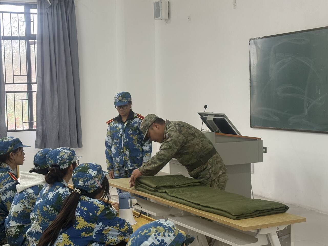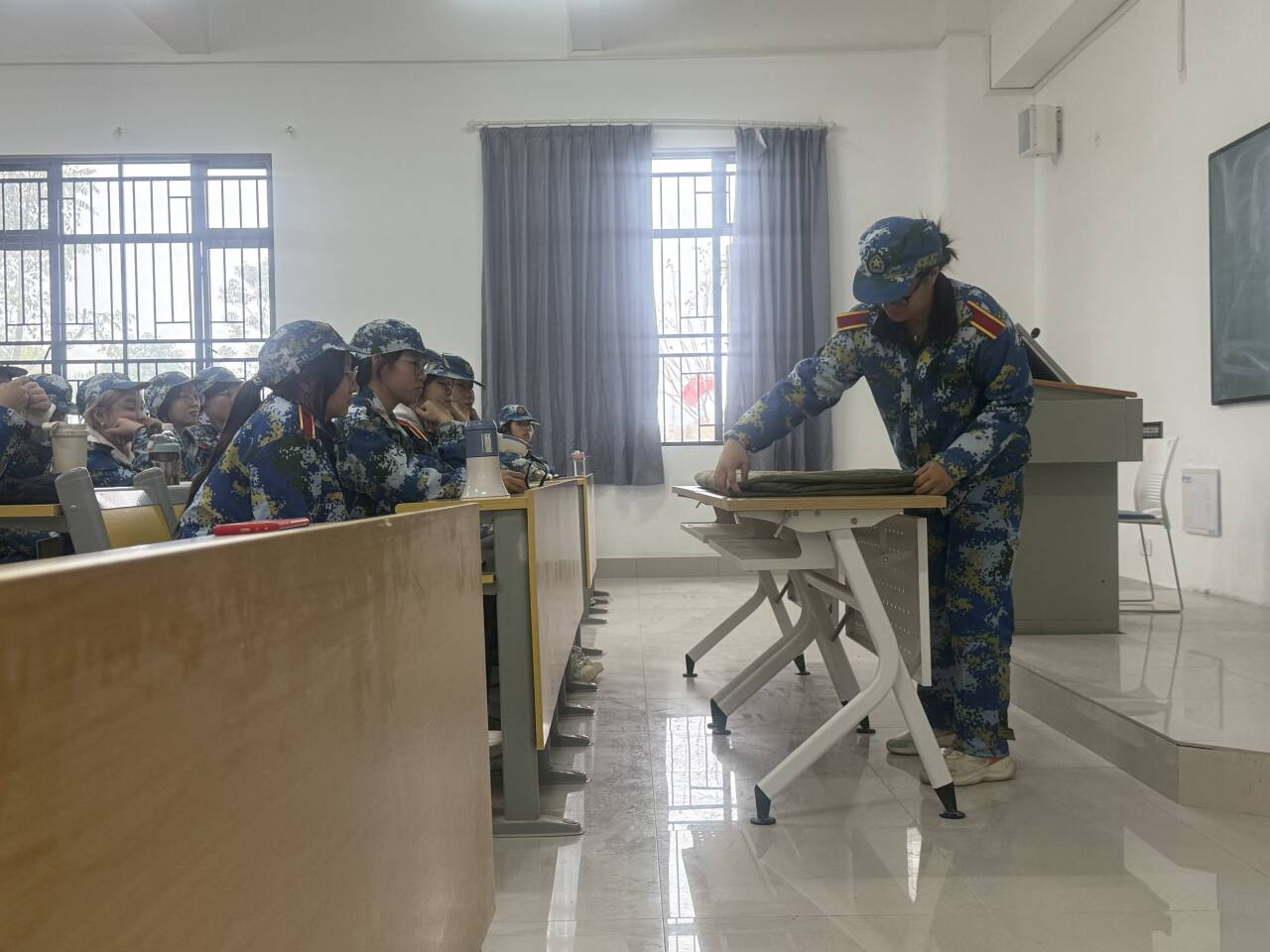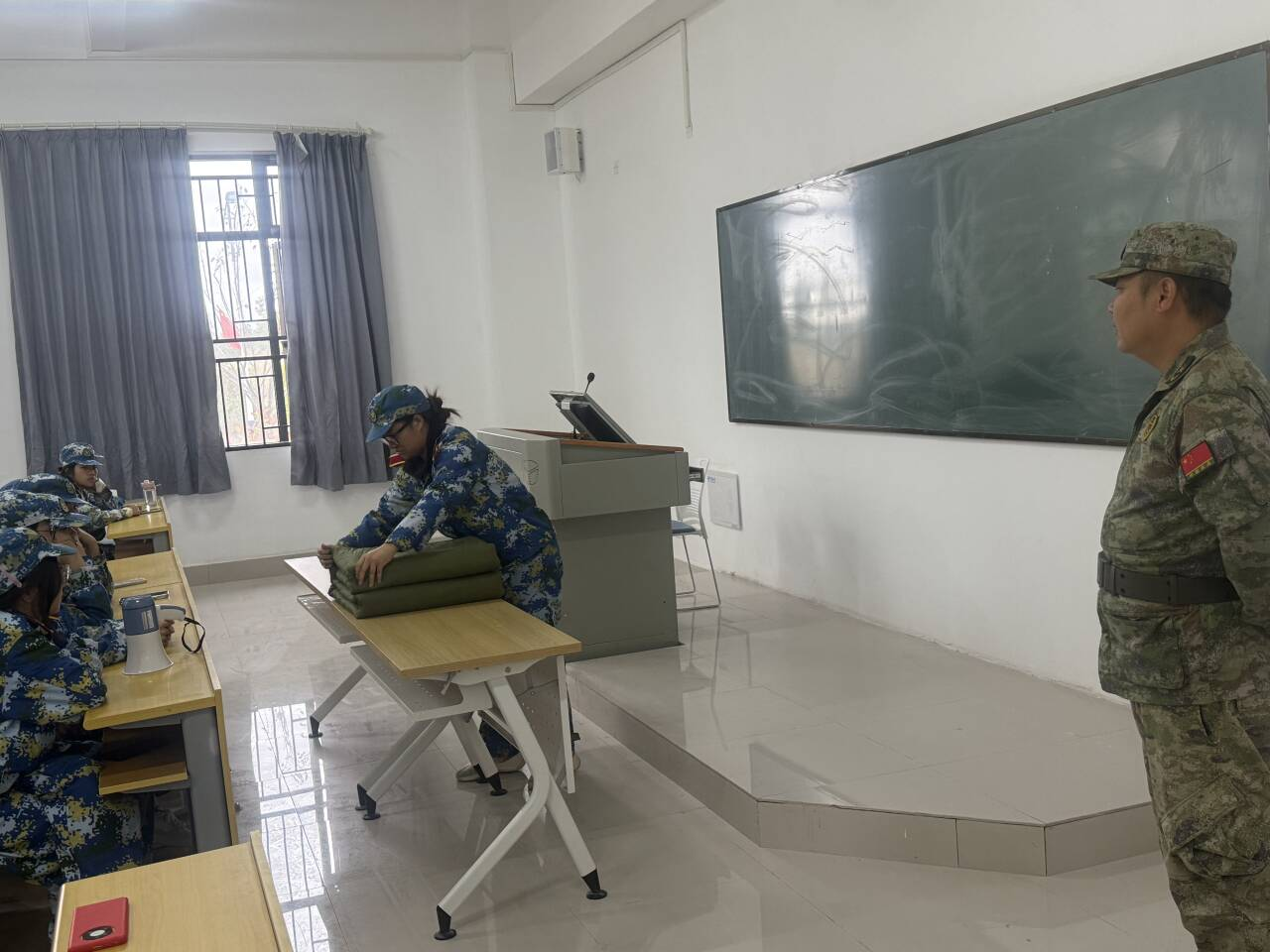 窗外雨声淅沥,教室内气氛却格外热烈。面对突如其来的雨天,军训教官们迅速调整训练方案,将“战场”从操场转移至教室。一张张课桌变成了操作台,一床床军被成为主角。教官表示:“天气是客观因素,但军人的作风和纪律性体现在方方面面,内务整理就是其中重要一环。雨天正是静心学习内务标准的好时机。”