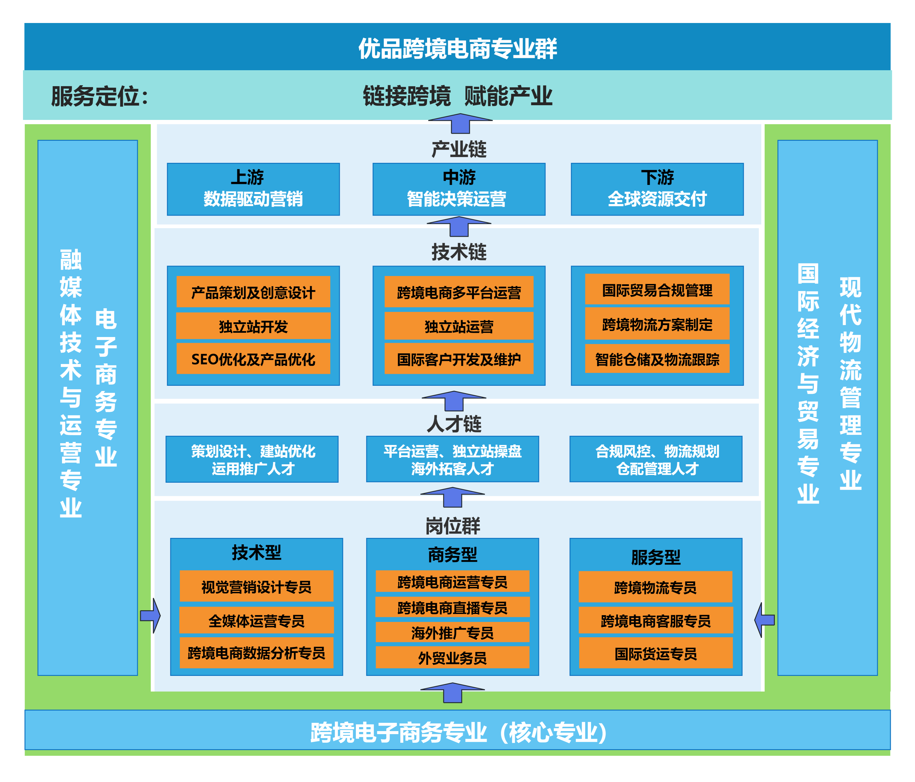 服务型岗位:跨境物流专员、国际货运专员、跨境电商客服专员等,由现代物流管理、电子商务专业支撑。
