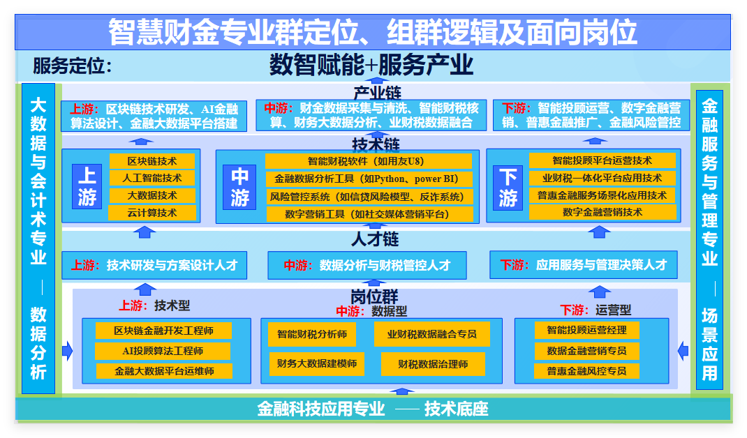 智慧财金专业群服务于数字财金产业链,该产业链呈现 “上游技术研发→中游数据服务→下游场景应用” 的三层结构,专业群三大专业分别对应产业链的不同环节,实现全链条覆盖。