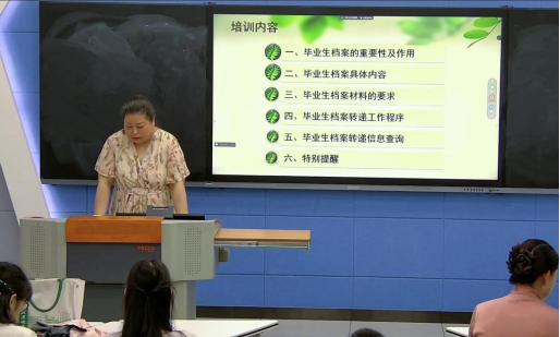 首先,万青馆长发表了动员讲话。她强调了毕业生档案的重要性,希望学部、就业办、档案馆相互配合、加强协同,高质高效完成2024届毕业生档案转递工作。随后,档案馆靳红老师通过PPT向大家详细讲解了毕业生档案转递工作的具体内容,包括毕业生档案材料的要求、档案转递工作程序、档案转递信息查询等内容。就业办李治主任传达了今年省里关于毕业生去向填报工作的最新文件精神,就业办李志文老师对今年网上毕业去向系统的填报进行了现场演示和指导。最后,就档案转递工作及毕业生去向系统填报工作等事宜进行了现场答疑。