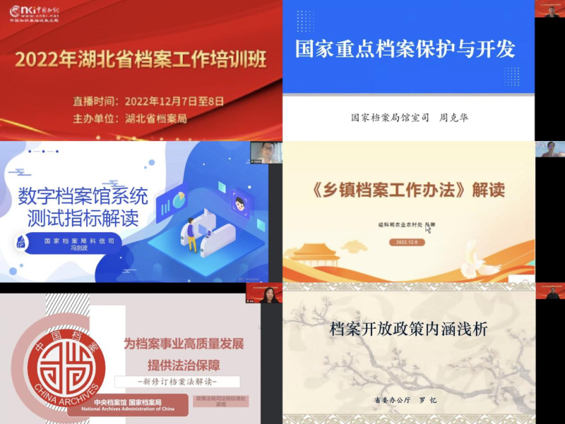 (通讯员 程灏璠)为了深入学习贯彻党的二十大精神,贯彻落实习近平总书记对档案工作的重要指示批示精神,全面落实省委书记王蒙徽对档案工作批示要求,全面提升档案工作人员业务能力和水平,12月7日至8日,由湖北省档案局主办的全省档案工作培训班在知网在线教学平台进行线上直播。档案馆全体专职档案员认真学习了本次培训课程,并积极组织图书馆各部门负责人及学校各部门专兼职档案工作人员参与学习。