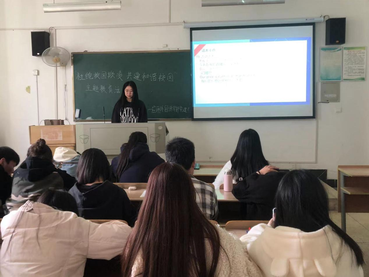 开展主题班会。商务日语3班班长胡帆精心制作课件,通过真实案例,从校园欺凌的主要表现形式、校园欺凌所产生的后果等方面教育同学们,杜绝校园欺凌,涵养理智,莫让美好的青春蒙受冲动的惩罚。