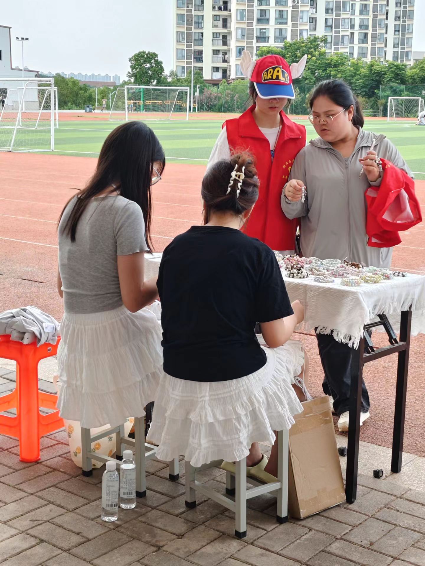 活动现场,摊主们将自己的物品搬运到跳蚤市场的摊位上。她们将物品摆放整齐并附上价格标签,不久后同学们逐渐来到跳蚤市场。摊主们开始忙碌起来了,与他人交流、展示自己的物品,并与对方协商价格,最后双方获得自己心仪的物品。
