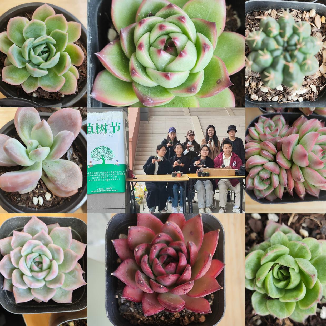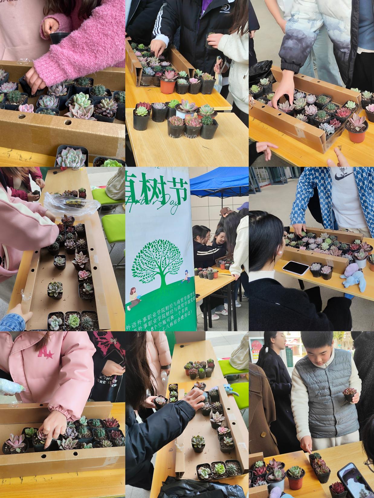 活动中,一盆盆整齐排列的多肉植物吸引了过往师生的目光,大家踊跃参与,纷纷带来平时积攒的空瓶来到活动场地兑换心仪的绮植。小巧的多肉色彩繁多,大家穿梭其中,纠结着自己应该选择哪一款。挑选完毕后,大家纷纷高举着自己的绿植合影留念。