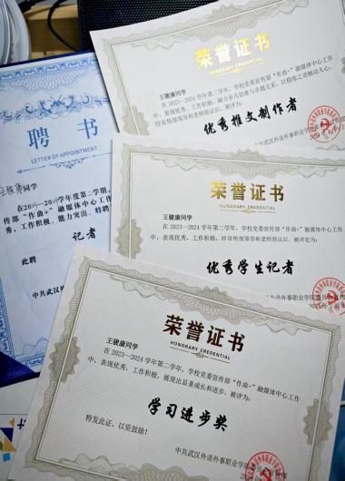 这份踏实付出,最终换来了亮眼收获:在校期间,王骏康先后斩获优秀推文奖、摄影奖、优秀学生记者奖、最佳组织者等多项荣誉,在融媒体中心更因高频高质产出,被大家亲切称为“高产记者”,成了团队里的“定心丸”。截至目前,他自大一时已撰写学校公众号推文98篇,累计浏览量超14万人次;采写新闻19篇,其中《【荆楚好老师群星计划】曾庆红:“侦察”“指挥” 样样精通,专业学习还得听他的!》荣获2024年度湖北高校新闻奖新闻标题三等奖;参与创作视频8条,总浏览量破8.6万人次;设计制作官网大图25张——每一组数据、每一份荣誉,都是他对“优质融媒内容”的执着坚守。