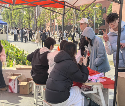 活动现场,“愿以吾辈之青春,捍卫盛世之中华”的红色展板醒目亮眼,“情牵华夏 恩泽故里 把历史写进诗”的标语温馨动人,与“同心共筑中国梦,矢志不渝向前行”的巨型横幅相互呼应,瞬间营造出浓厚的红色氛围。红色帐篷下,党建会成员们分工明确,有的负责引导学生参与问答,有的负责发放红色文创,有的负责讲解革命故事,忙而不乱的身影成为活动现场的温暖底色。