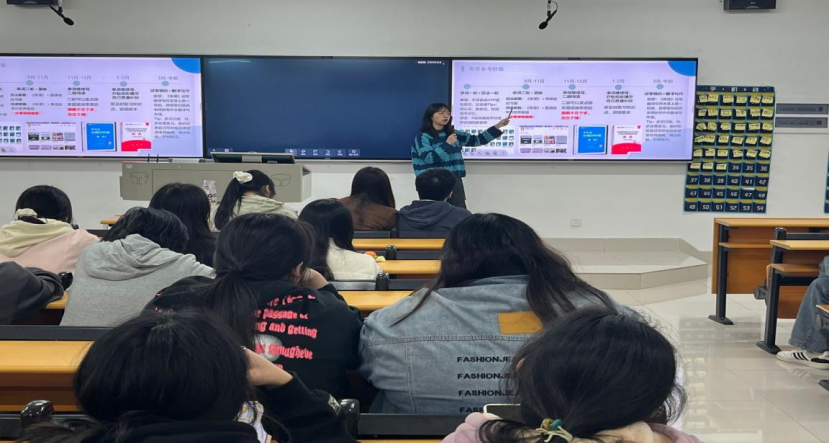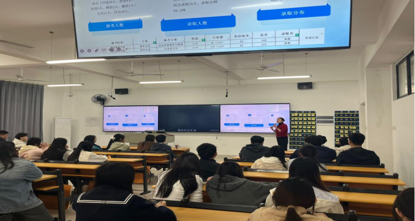 分享尾声,田颖还通过直观的数据帮助同学们精准把握升学竞争态势。现场互动环节气氛热烈,同学们围绕“英语四级备考与专升本英语衔接”“跨专业考研可行性”“备考资料筛选技巧”等核心问题踊跃提问,田颖结合自身经历逐一拆解,给出具体可操作的建议,让在场同学收获颇丰。