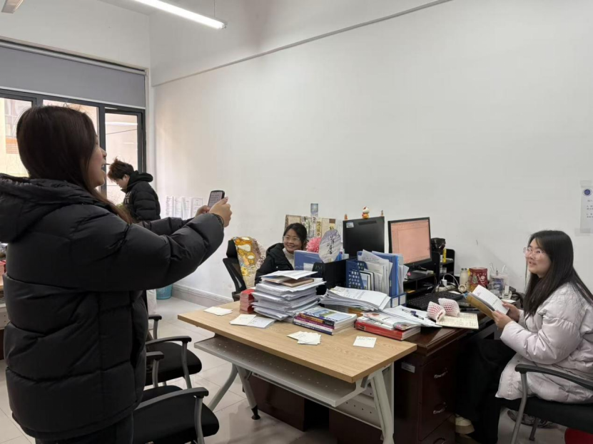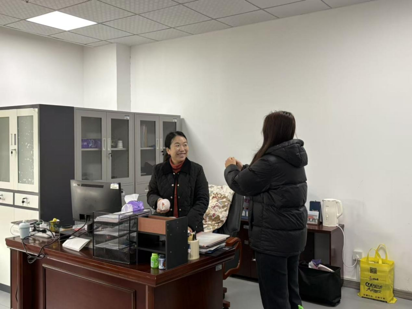 党建会会长李梦娇、副会长旬帅博及各部门干事齐聚一堂,在简短的活动部署后,大家精神饱满地准备开启此次温暖之旅。党建会成员们手持精心准备的苹果,有序前往各教师办公室。每到一处,会长与李梦娇副会长旬帅博便带头向辛勤耕耘的老师们送上节日的问候,部门干事们也纷纷递上象征着“平平安安”的苹果,并致以诚挚的元旦祝福。