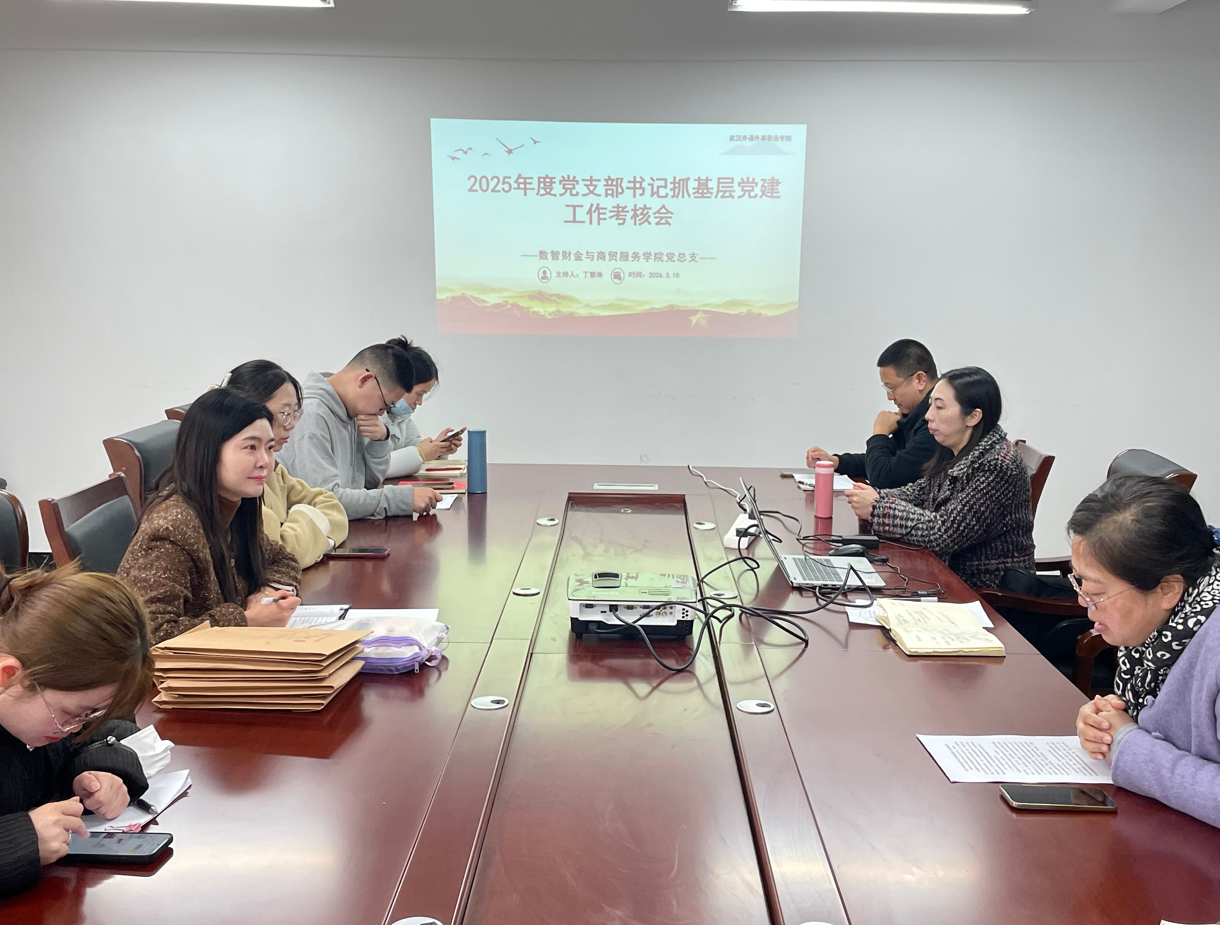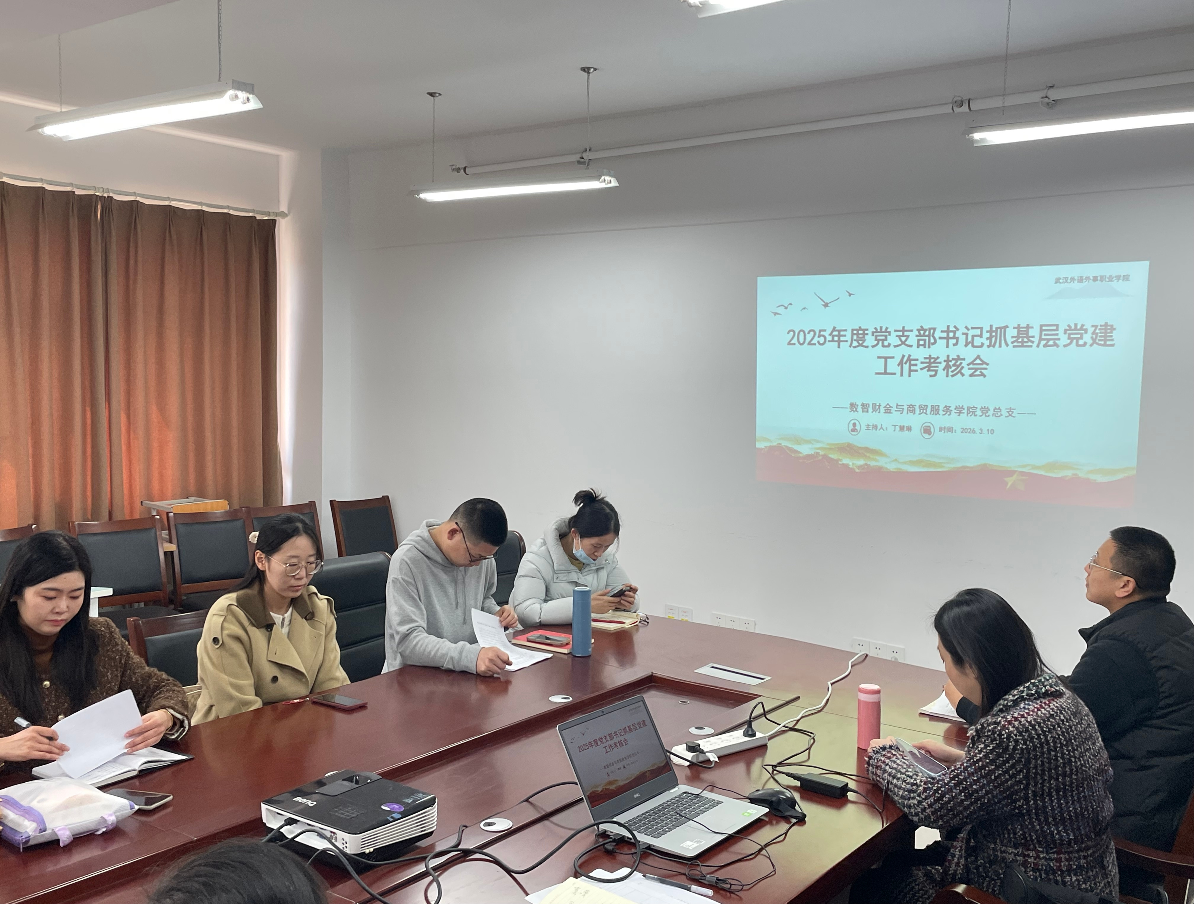 为深入贯彻新时代党的建设总要求,全面检验基层党建工作成效,2026 年 3 月 10 日,数智财金与商贸服务学院党总支在木森楼411会议室召开 2025 年度党支部书记抓基层党建工作述职考核会。会议由党总支副书记丁慧琳主持,学院全体党员及支委成员参会。
