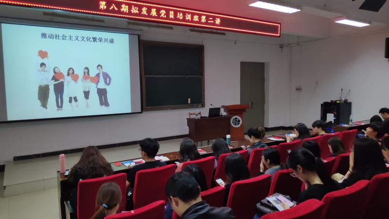 2018年4月18日下午六点,武汉科技大学城市学院,武汉外语外事职业学院于南一报告厅进行了第八期拟发展对象的第二次党课的授课。本次党课的主讲老师为刘洋老师,以“推动社会主义文化繁荣昌盛”为主题向拟发展对象们从各个方面讲述了文化实力对于中国的重要性,提高软实力对于实现中国梦的必要性。
