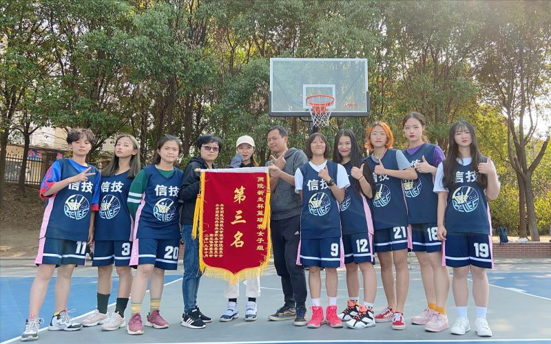 “哔、哔、哔”哨声响起,双方就位,裁判手中的球抛出了手。突然“信技加油!信技加油……”的喊声炸裂耳旁,原来是前锋抢到了首球。看着她双手运球、晃人突破、手起足落,一气呵成的动作毫无意外地入框得分。率先拿分,点燃了双方队员的斗志。场下的观众呐喊助威,场上的队员捷报频出。一阵阵加油声配合着队员们进攻、防守。体力渐渐耗尽,比赛也接近了尾声。